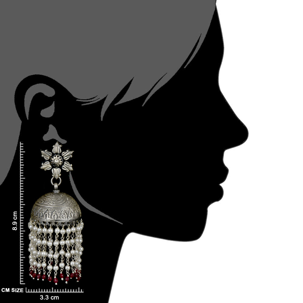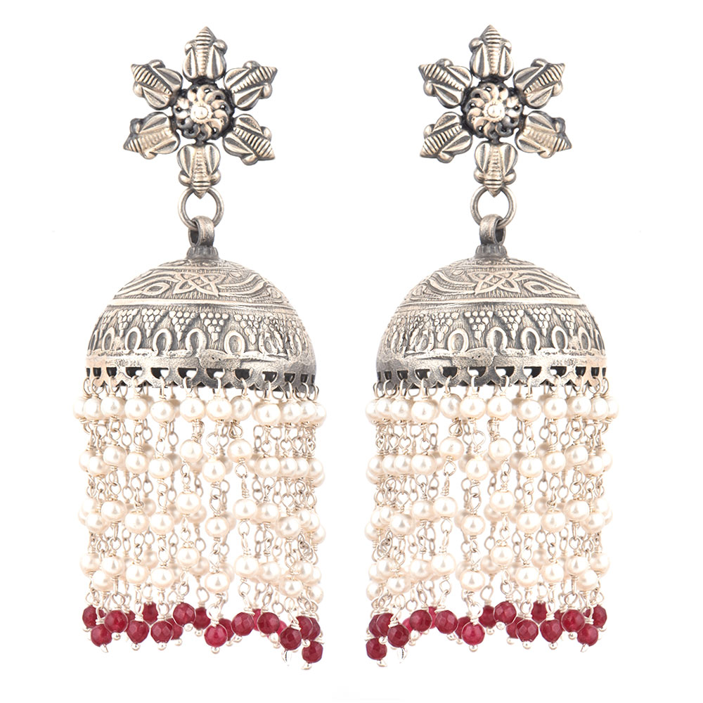 Long Chandelier 92.5 Sterling silver earrings with lotus flower studs and long hanging tassel made of silver beads and finished with a layer of red onyx beads .The beauty of these earrings is that it can be worn with traditional as well as modern wear. Wear it for Diwali, wedding, engagements and other auspicious functions.