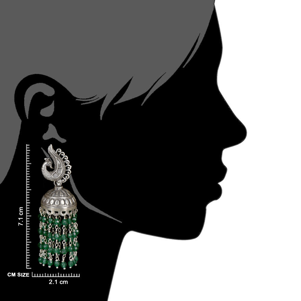 92.5 Sterling Silver Earrings are made of engraved peacock on the sterling silver stud attached to hanging chandelier tassels made of tiny green onyx stone and silver attachments that gives a cascading effect to the earrings. Team it up with a traditional attire like a heavy embroidered sari or lehenga and the best part is that it suits girls and women perfectly.