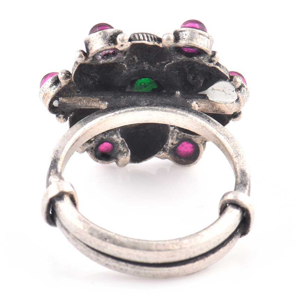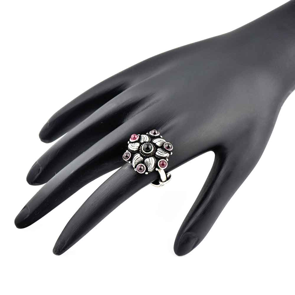 A very regal looking 92.5 Sterling Silver Ring hand crafted by the master craftsmen of India has a lovely leafy flower with amethyst and onyx stone in oxidized silver metal .It suits all kinds of traditional wear and is the perfect gift for your sister, wife, mother, friend colleague or other family members.