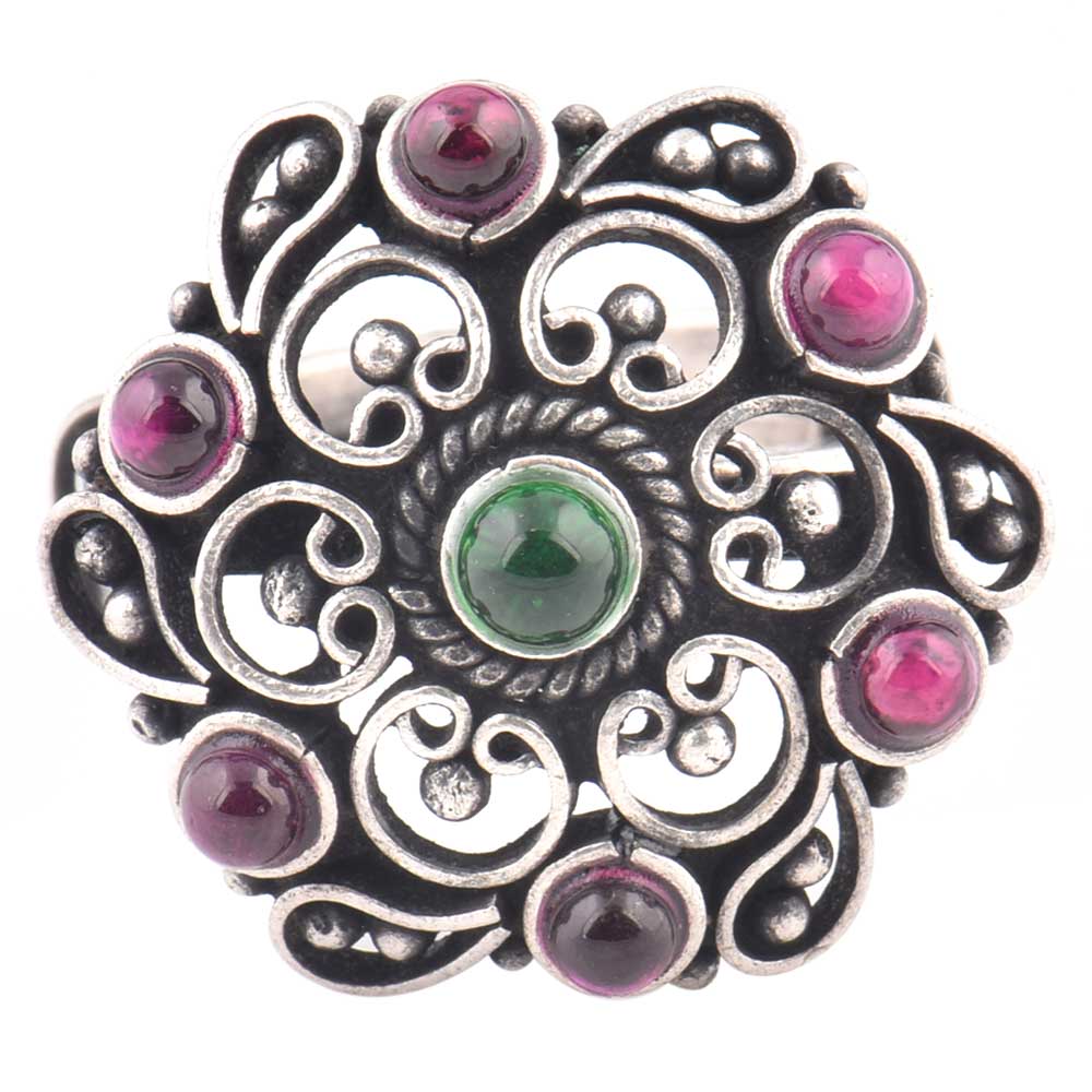 92.5 Sterling silver ring adjustable with elaborate design of floral and paisley design with amethyst and onyx stones studded ring .An exclusive ring for a formal function such as weddings, engagements , bridal shower, parting gift, souvenir or as a token of love . Can be worn by girls, sisters, wives and that someone special.