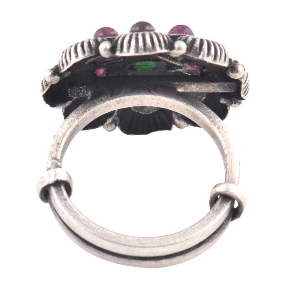 Exclusive party wear 92.5 Sterling Silver Ring adjusted according to your finger in floral petals and round amethyst and onyx stones fixed in the ring. Wear it for engagements, wedding, bridal shower, Diwali, New year and other religious functions and ceremonies . Ideal gift for sister, mother, wife and friend.