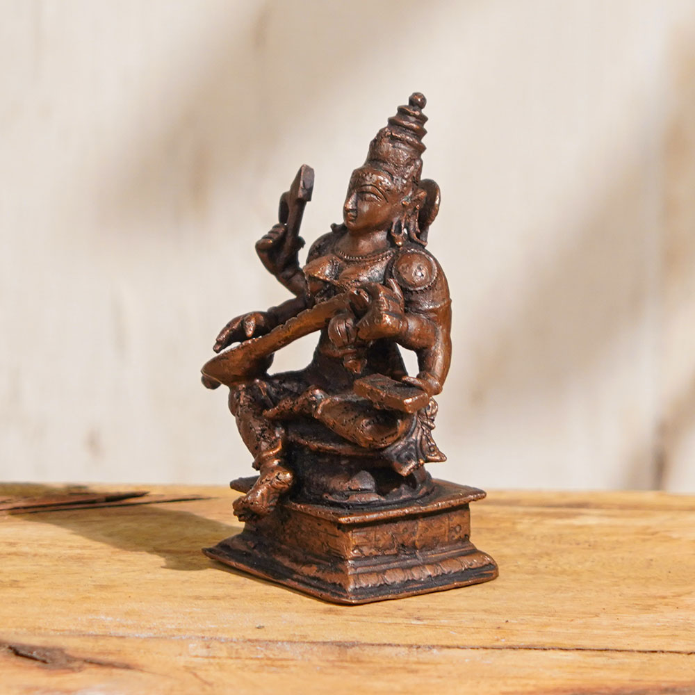 An exquisite copper statue that depicts the Hindu goddess Saraswati, the patroness of knowledge, arts, and music. Seated with her veena in hand, this stunning statue is a symbol of creativity, learning, and inspiration. Handcrafted by skilled Indian craftsmen, this statue is made of copper, which is considered to be an auspicious metal in Hindu mythology. The intricate details of the goddess statue nd the delicate curves of the veena are all testament to the dedication and skill of the artisans who created it. This beautiful Saraswati copper statue is perfect for use as a Hindu god idol in your prayer room, or as a decorative item in your home, office, restaurant, hotel or shop. Its elegance and craftsmanship make it an ideal gift for special or festive occasions, such as weddings, housewarming ceremonies, or religious festivals. If you're looking to buy a Goddess Saraswati idol online, this copper statue is an excellent choice.