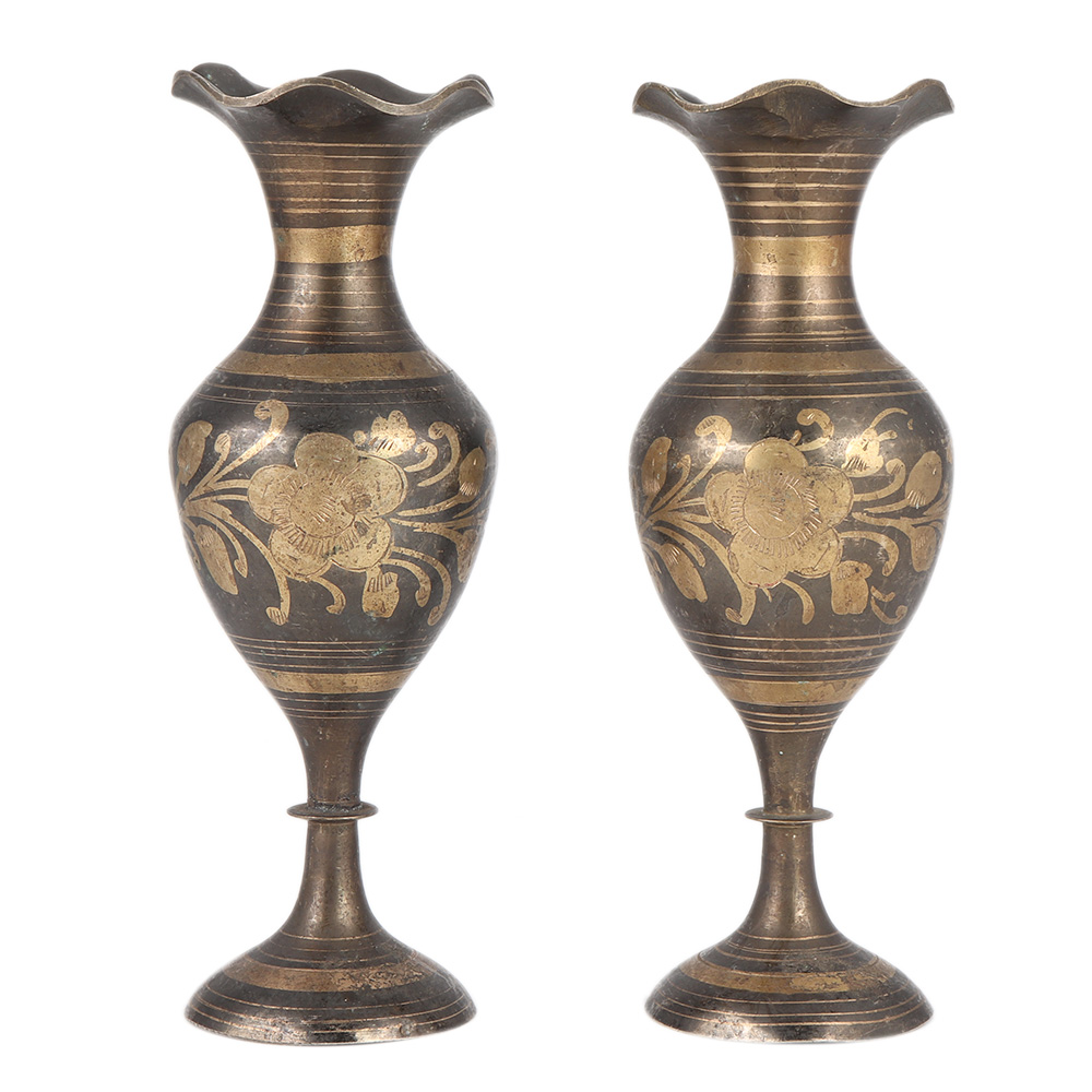 Medium Sized Etched Brass Vase In Pair . These vases have an extraordinary appearance, and it is most likely the nicest of its kind. The sculpture is made of brass and is lacquered in black. You'll notice hand-etched designs and details throughout, as well as a stylish fanned lip.