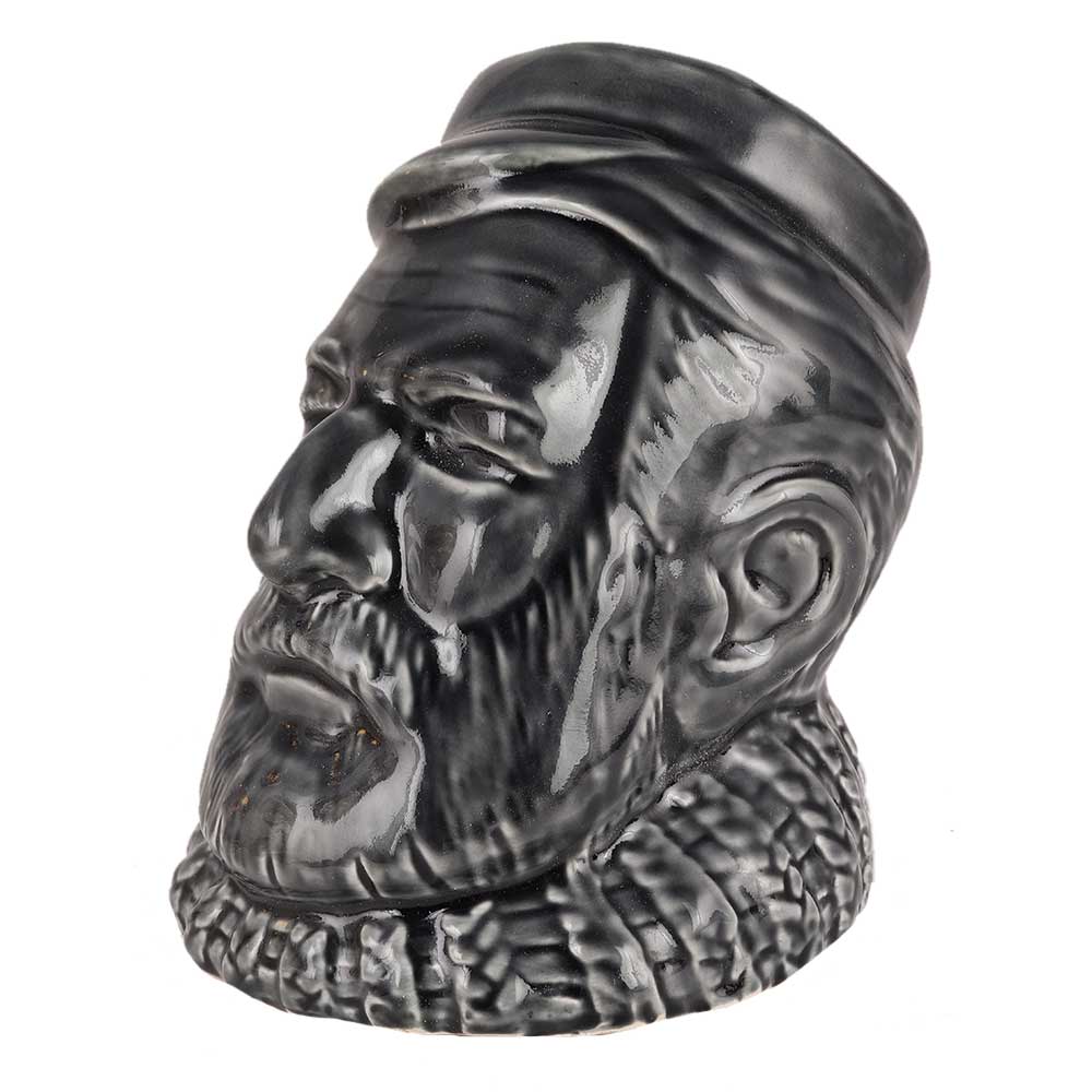 This statue is modeled after Ernest Hemingway, who is dressed in a cap and a thick nautical-style sweater. Glazed in a dark blue glaze (petrol blue). The pullover, in particular, matches the one worn by Hemingway in a shot taken by renowned portrait photographer , which is one of the most iconic images of Ernest Hemingway.