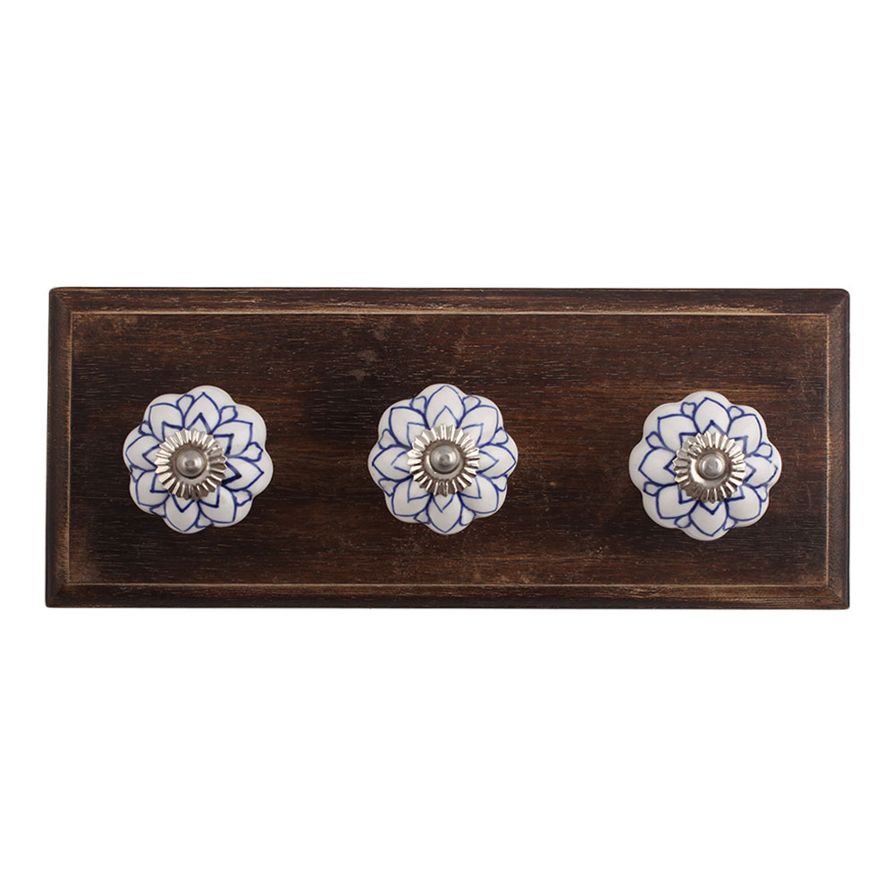 Blue Lotus Ceramic Wooden Hook. A Perfect Complement to the Soft Tone of the Wood are these White Traditional Hat & Coat Hook Made of Genuine Porcelain and Brass. It can be use to Hang Jewellery, Leashes, Towels, Scarves, Light Weight Sweaters, Caps Etc.