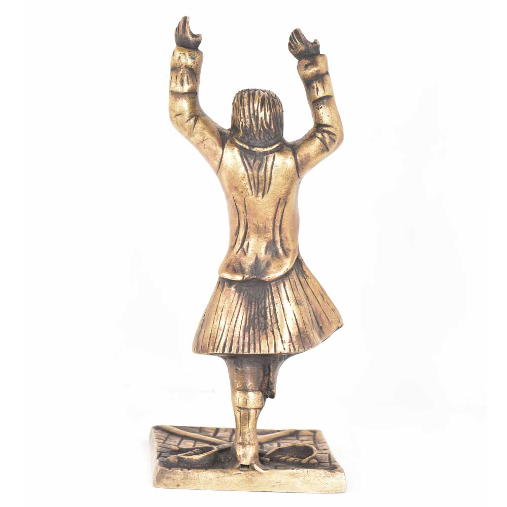 A very unusual looking brass figurine of a soldeir with both hands raised above his head . He looks like a soldier as two swords are lying near his feet. The aged soldier is dressed in his uniform on one leg which is probably a gesture of thanking god almighty.
