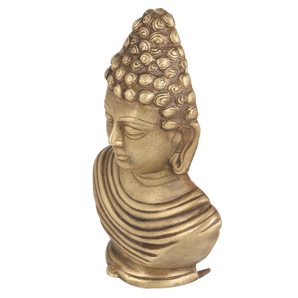 A Buddha bust statue carved from a brass alloy. It was handmade by skilled Indian craftsmen. It was carved with intricate details. Placing the Buddha statue in a corner facing east gives peace to the mind and stimulates energy. You can also place the Buddha in your pooja room. It is believed to spread positivity in the house. You can also place the Buddha bust in your office, restaurant or shop. A perfect gift for all occasions for your friends or relatives.