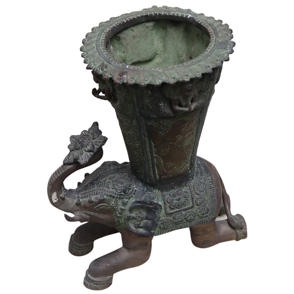 AÂ medium-sized Indian brass elephant from the 19th century that might have come from a temple. The artwork depicts an elephant with a vase on its back and a colourful robe covering its body. The vase contains floral designs, foliage motifs, and garlands on either side as design components. An excellent gift for friends and family.