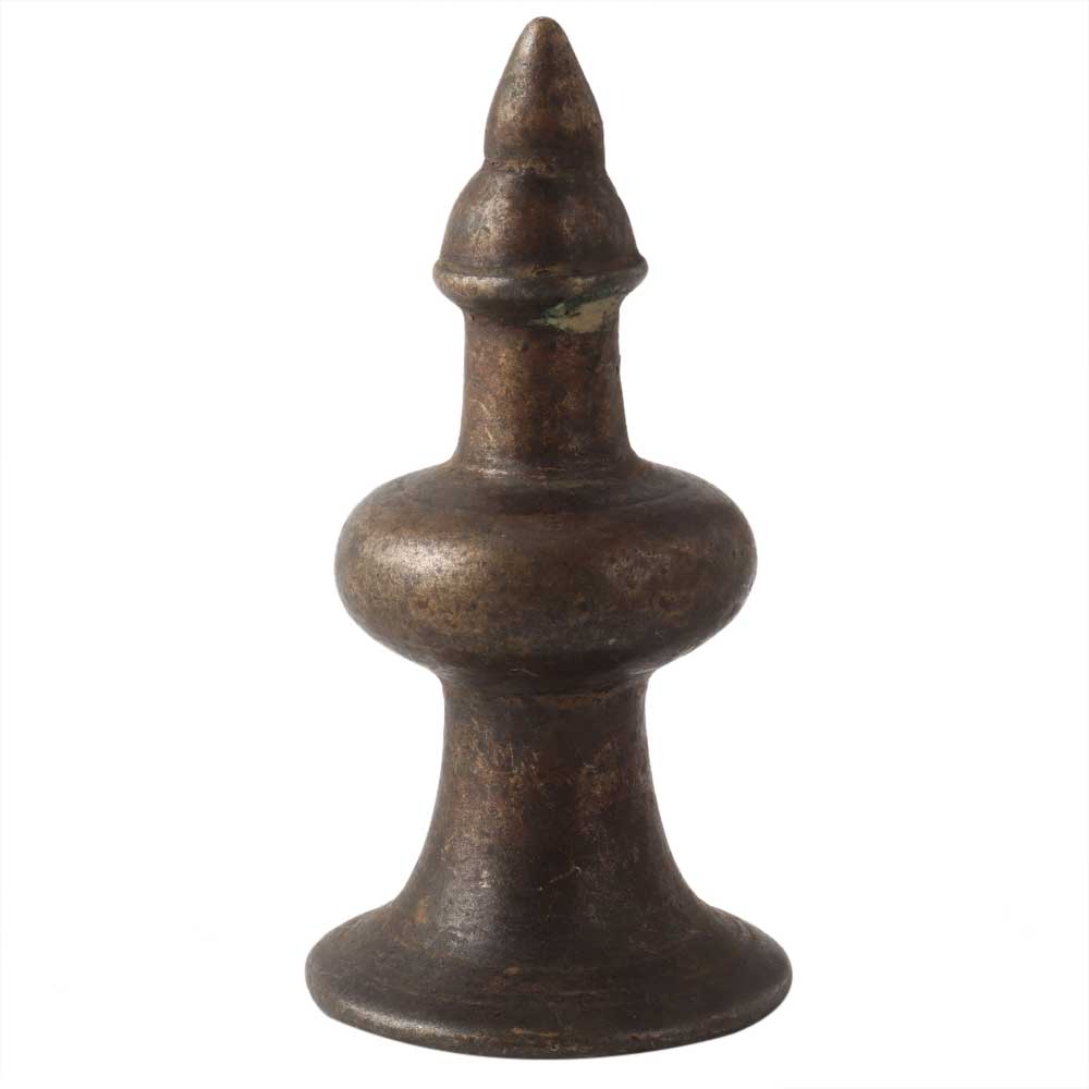 A straightforward yet exquisite cast brass roof finial that still bears traces of its original green paint, which is thought to have come from the railroad yard or station. The design resembles a spike perched atop a ball with a stepped base. A hollow neck or locating tube  located below this. A unique ornamental item that will instantly give charm and a sense of the industrial past to your house or yard.