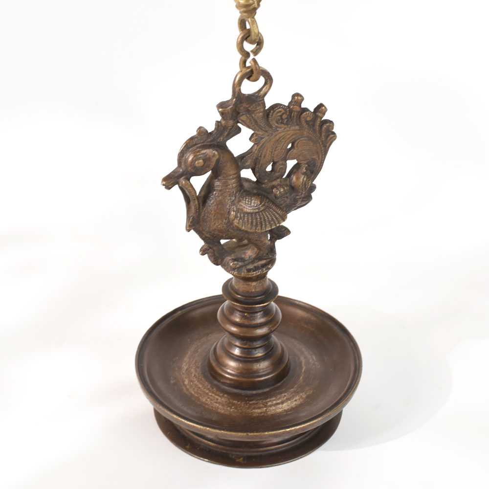 This is an intricately carved Annapakshi sculpture diya on a brass hanging villaku oil lamp. The lamp is typically found at the front door of most houses and serves as a welcome sign for all visitors. It's thought to live in heaven. The bird is typically shown holding a flowering vine in its beak, which represents abundance. During holidays and all puja / prayer ceremonies, it is important to light the diya or lamp to bring light, prosperity, and happiness to the entire family.