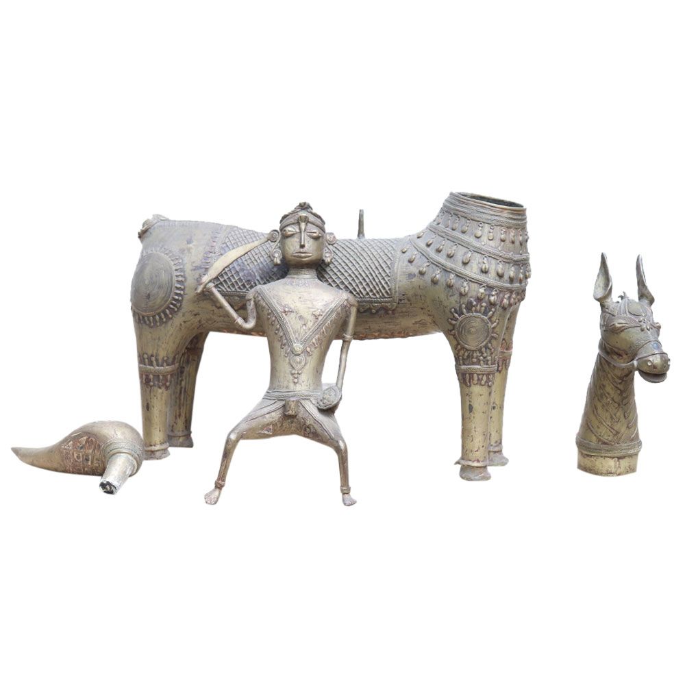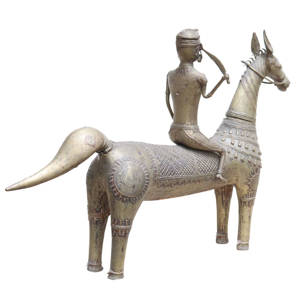 A delightful old vintage Indian Dhokra horse and rider sculpture is presented. The natural patina and clear evidence of age indicate that it dates from the late nineteenth century. It portrays an Indian Warrior mounted on his horse holding a sword in his right hand. The warrior is dressed in traditional Southeast Asian Indian costume and holds the horse's reins in his left hand. The horse's body is made up of lines (in the Classic Dhokra Style), and it wears a tribal headpiece.