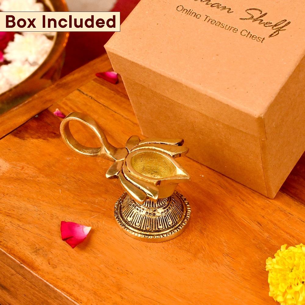 Light up your sacred spaces with the Brass Lotus Shape Oil Lamp on Stand with Handle, a handcrafted diya that beautifully combines devotion and artistry. Designed in the graceful form of a blooming lotus, this diya reflects purity and spiritual awakening. The sturdy brass stand ensures stability, while the easy-to-hold handle makes it functional and traditional at the same time. With its golden polish and intricate detailing, it’s an elegant centerpiece for daily puja rituals and festive celebrations.