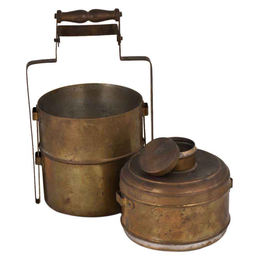 Handmade brass three tier Tiffin box with an additional small storage box that is fixed to the top container . It has an adjustable frame and handle . It was used to carry food from one place to another now it is used as a showpiece, as a table display for presentation of food and as a gift for your near and dear ones.