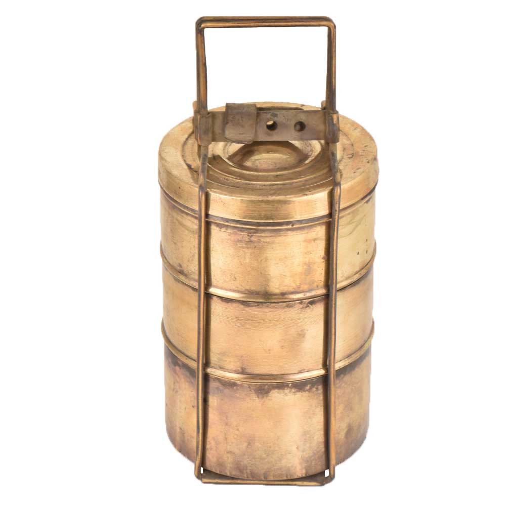Brass Tiffin boxes with three containers is made by the expert craftsmen of India by using traditional tools .The Tiffin box has three containers placed one above the other and secured with the help thin brass strap with a single lid placed on the topmost container . Excellent gift for friends and relatives, house warming gift or kitchen display product.