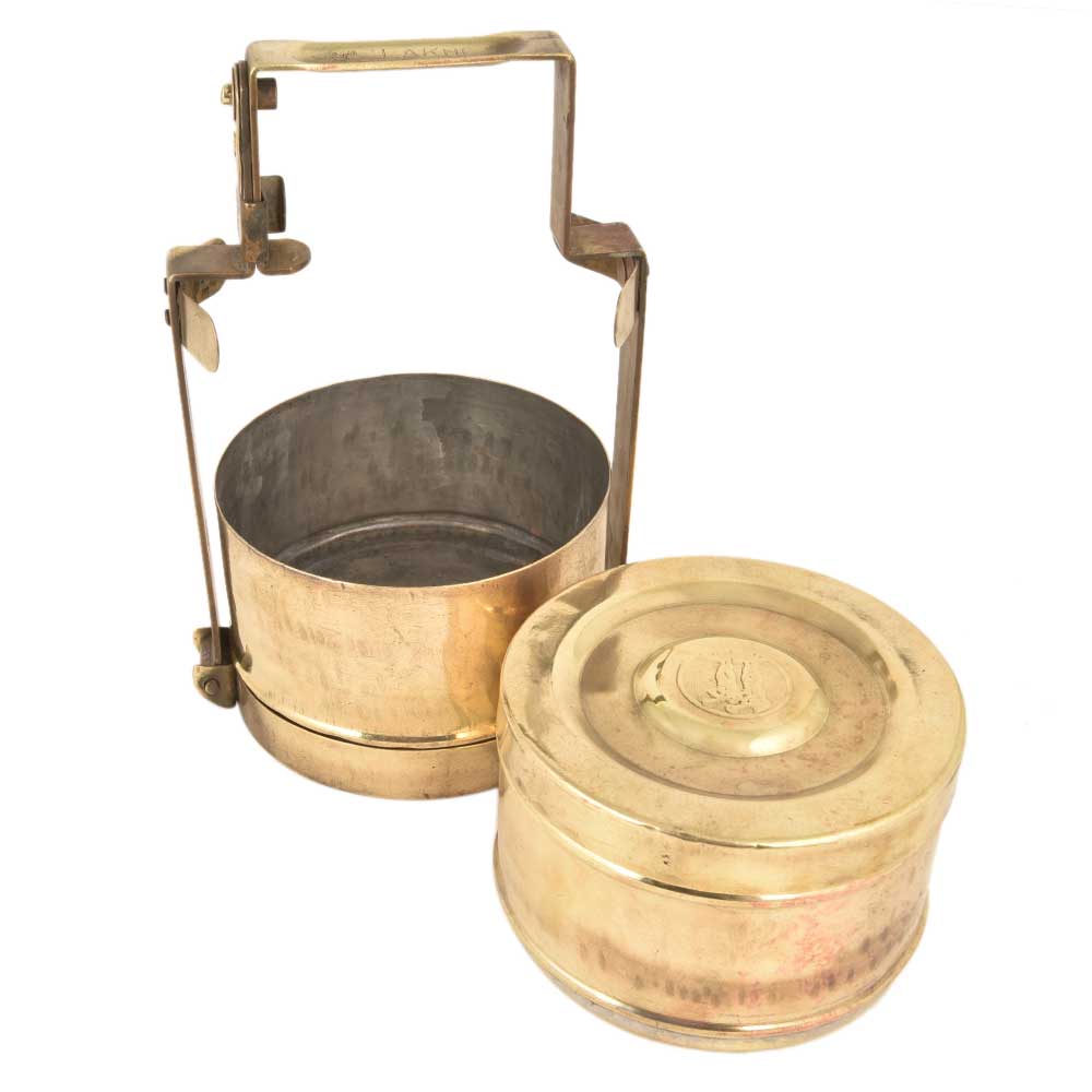 Two Container Brass Tiffin Box handcrafted by the Indian craftsmen using traditional skills and methods. It has two containers with a brass frame with lekhi engraved on the top of the frame and a faint logo on the lid of the top container of the Tiffin box. Use it for presentation of flowers , as a planter, corporate gift or gift for near and dear ones.