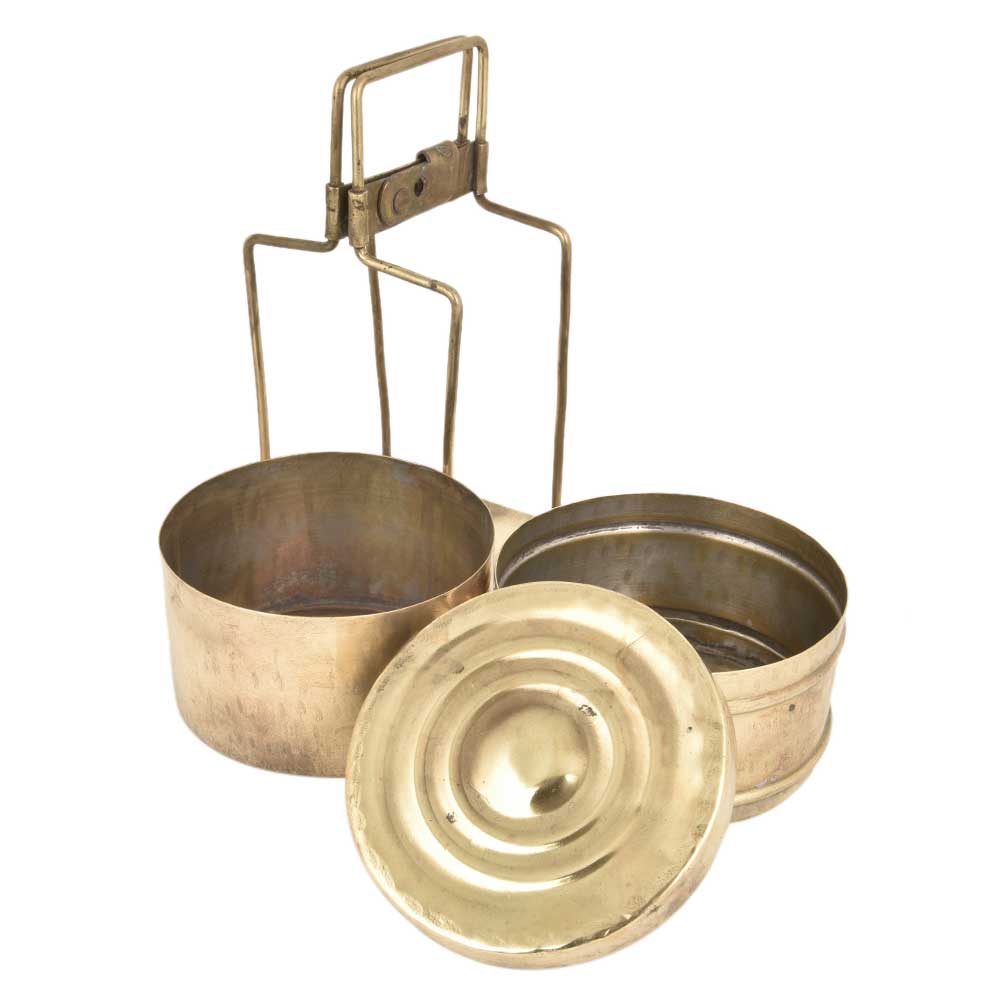 Two Tier Brass Tiffin Box With A thin Brass Strap Frame that holds the two boxes place with a lid on the top container with a traditional locking system. It can be used to store jewelry, documents, spices or as a showpiece for the kitchen shelf .Use it as a planter, for presentation of food for bloggers, corporate gift or gift for near and ear ones.