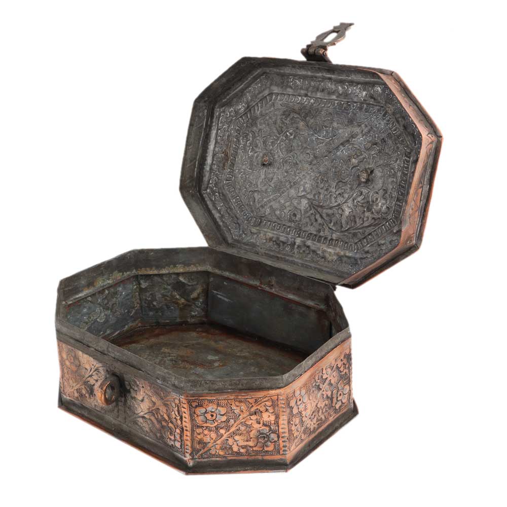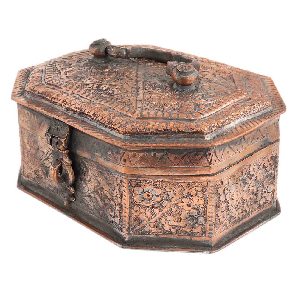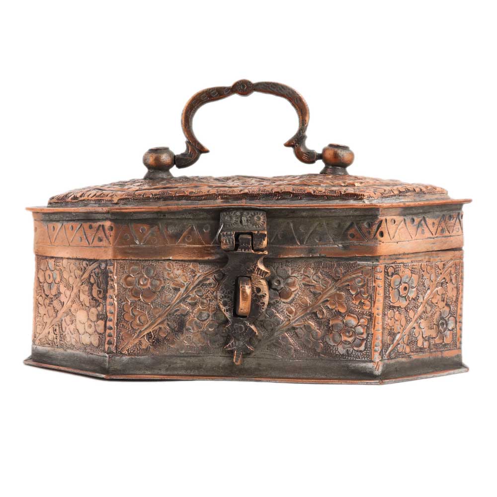 Copper Jewelry Box With Floral Kashmiri Repousse Artwork is very time consuming and it takes days or even weeks by the artisans to prepare a single piece . You can store spices, nuts, trinkets etc. Table decoration at home, office ,school and other institutions. Diwali ,wedding , anniversary and house warming gift.