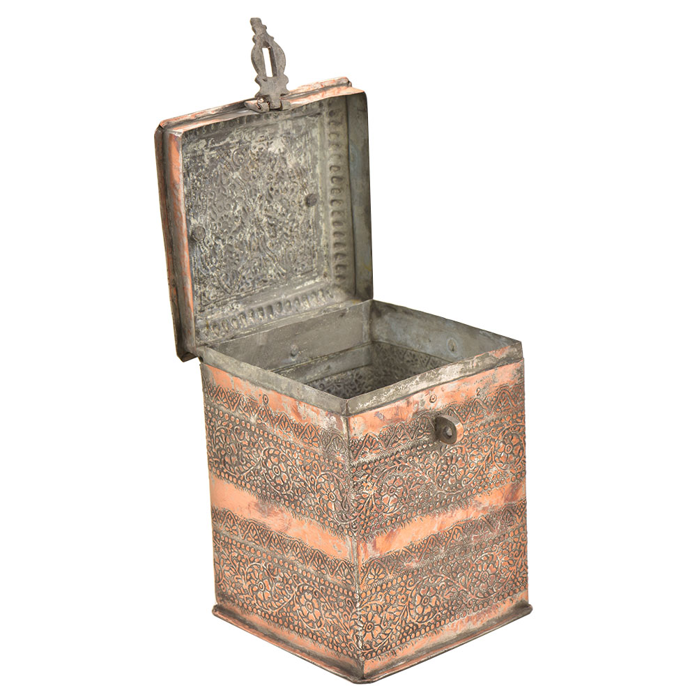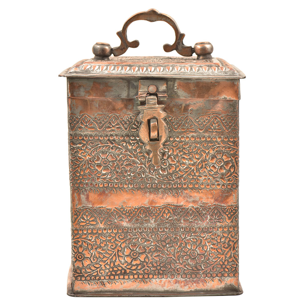 Handmade vintage Copper storage box or canister has a simple, classic design will add a touch of class to any set of decor due to its elaborate repousse design on the box as well as the lid. It also has a latch that keeps the stuff safe and secure.