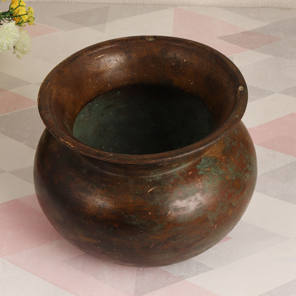 A vintage brass cooking pot that is meticulously handmade by highly skilled Indian artisans in the Assamese Art tradition. With its antique brown finish and high-quality brass construction, this unique piece is a testament to timeless craftsmanship. This vintage brass cooking pot transcends its culinary roots to become a versatile decorative item. Whether gracing your home, office, restaurant, hotel, cafe, or shop, it brings a touch of elegance to any setting. It’s warm, rustic charm makes it an ideal choice for indoor flower arrangements, breathing life into your space in a distinctly vintage manner. While this pot bears the history of culinary traditions, we recommend its use purely for decoration purposes, preserving its vintage allure. It's a prized addition to any antique collection and a thoughtful gift for your family, friends or relatives on special, festive, or auspicious occasions.