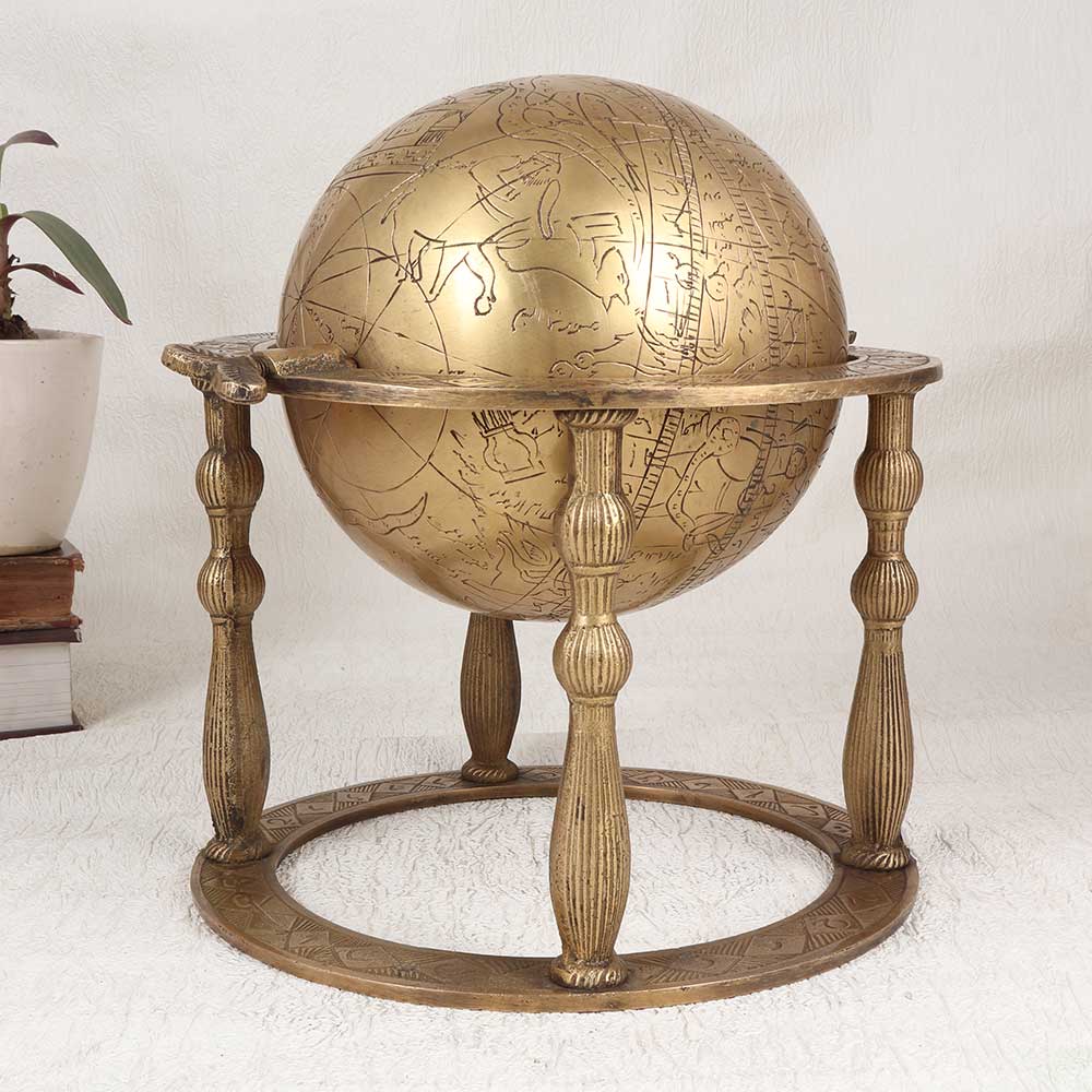 Immerse yourself in Islamic history and geography with this vintage brass art globe. Each intricately lettered location transports you back to the Golden Age of Arabic science and artistry. This stunning globe doubles as home decor and a window into the past. Spin the globe and visualize how Arabic explorers mapped the world. Trace the paths of legendary travelers like Ibn Battuta as you learn the history and meaning behind each scripted locale. Kids and adults alike will love using this artful globe to sharpen geography skills. Bring the rich history of Islamic science and culture to life in your home with this vintage-styled brass globe. With intricate Arabic scripts naming each continent and region, this globe allows you to explore the world like ancient Arabic cartographers. An illuminating statement piece!
