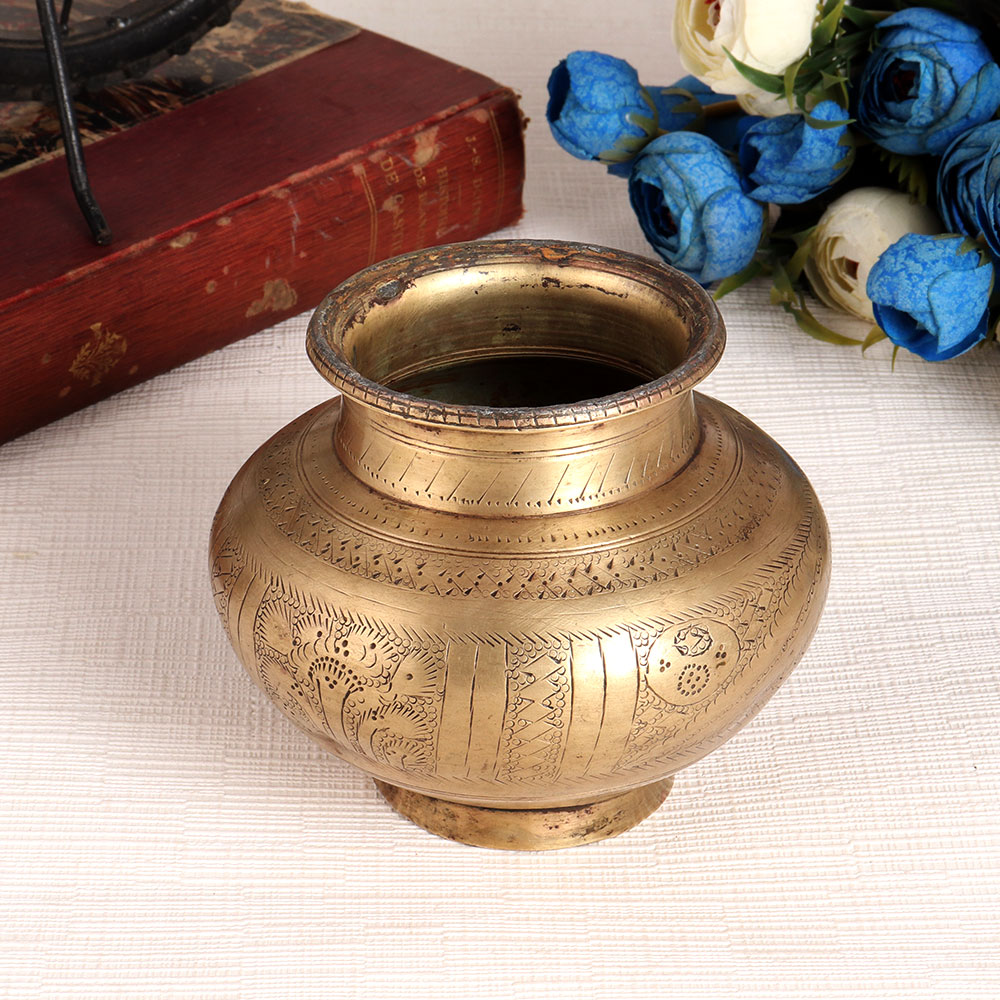 A brass lota engraved with beautiful motifs that will be a centre of attraction in your vintage art collection. This sturdy brass lota has an elegant brown finish that is often used to decorate stages, homes and offices. Buy a brass water pot online to get hassle-free delivery right to your doorstep. This brass water pot is made by highly skilled Indian artisans using traditional methods. Made of high quality brass, this lota will enhance the interior design of your home. Use this lota and offer water to the Sun God as it keeps the mind and body in balance. A beautiful gift for your loved ones on festive or auspicious occasions.