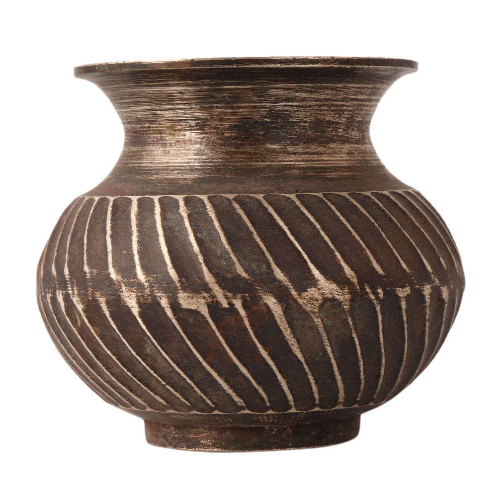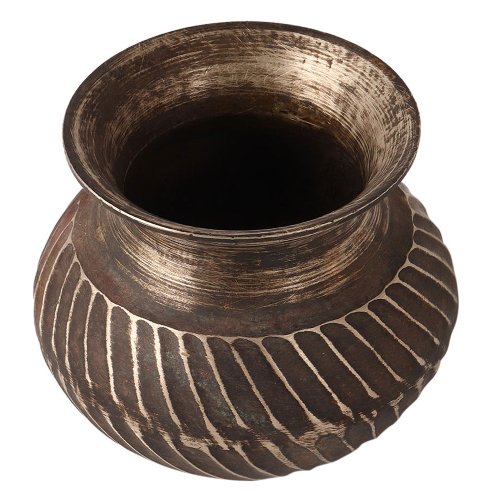 Beautifully engraved bronze holy water pot, handmade by skilled Indian artisans. It was used in homes and temples to hold holy water, rice, flowers, etc. Use this pot as a gift in a ritual place.