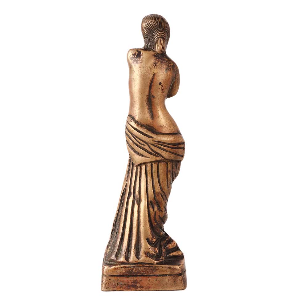 The Venus de Milo is a famous ancient Greek statue depicting the goddess Aphrodite (known as Venus in Roman mythology) The Venus de Milo is notable for its striking beauty and the graceful, flowing lines of the figure's form. The statue is particularly famous for its lack of arms, which were likely lost or damaged over the centuries. Despite this, the Venus de Milo remains one of the most celebrated examples of ancient Greek sculpture, admired for its masterful craftsmanship and enduring elegance. The Goddess of beauty and love is the epitome of the perfect female form; she is portrayed almost nude with her sinuous-shaped body, and she is posed in a traditional S-curve to show off her aesthetic allure. This fine sculpture is created from brass that has been given a dark brown patina.