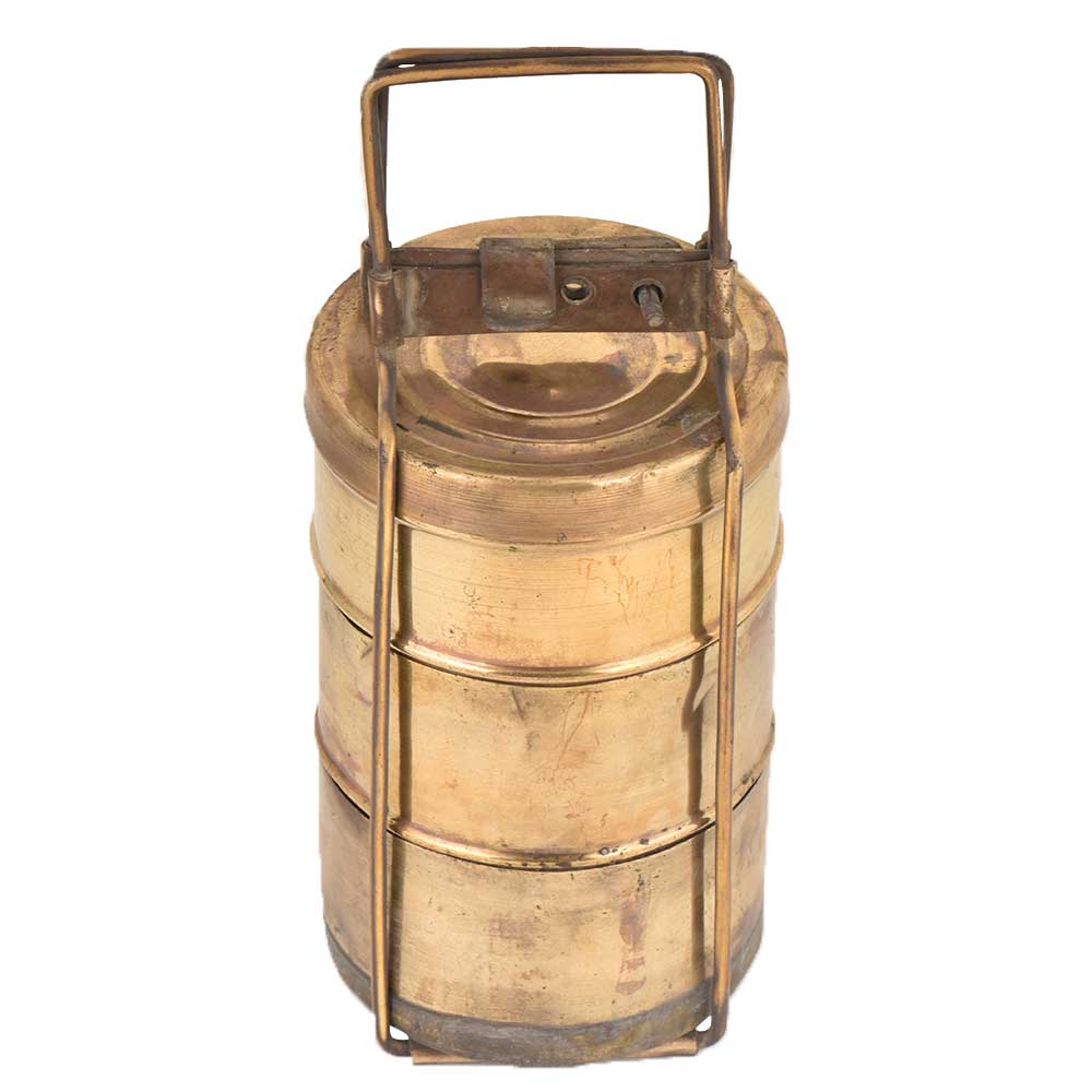 Handmade brass Tiffin box with three containers that are round in shape with rectangular handle that can be locked with the help a latch on the top of the frame. The bottom box has a slight patina while the other boxes have lovely golden color. Nice Kitchen decoration , Gift for friends and relatives who love to collect vintage stuff.