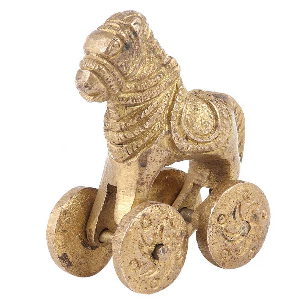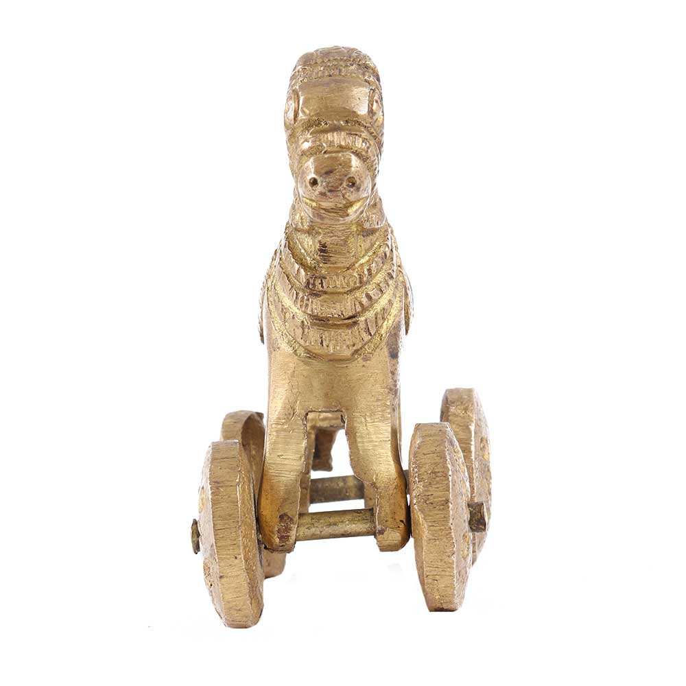 Toy horse statue from a solid brass hindu temple in southern India is an exceptional rare collectable toy . The horse is supported by four wheels and is equipped with a lovely bridle. The horse and wheels is in excellent antique condition that helps the toy run smoothly on the wheels.