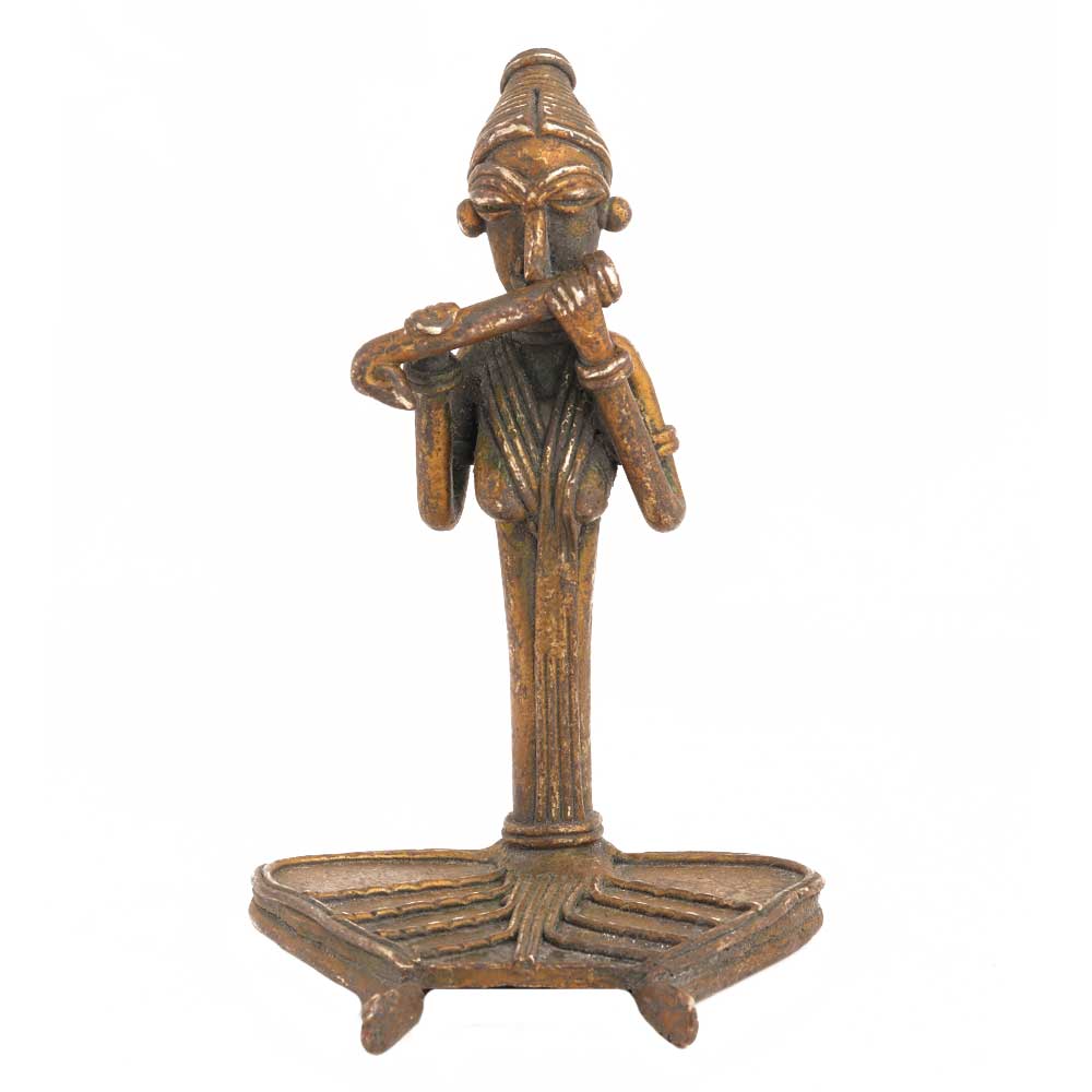 This is a brass dokra art statue of musician playing mahuri a kind of musical instrument of the tribal community. This figurine is created by skilled tribal craftsmen using traditional manual techniques. It can be used as an elegant exhibit on a living room table or glass shelf.