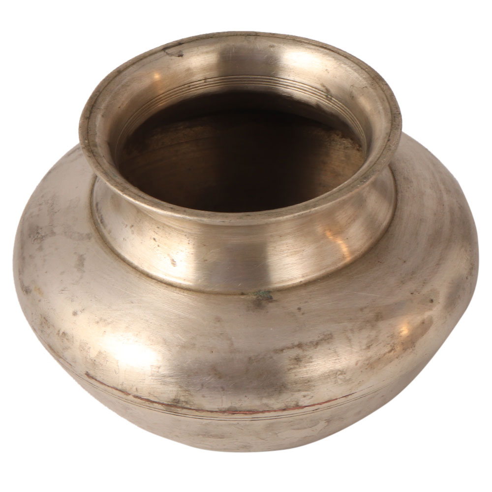 This vintage Indian lota or water vessel has a simple design with a round ring in the centre. It is made of white metal alloy and has a flat bottom to stay on the surface. It has been used since ancient times by our ancestors to worship the gods. It can be used to enhance the interior design of your home and office.