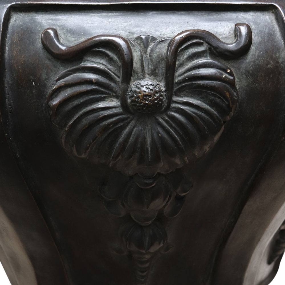Urn in the shape of a (bell) with a lid and flared, masked handles that show a guy with a moustache. a hexagonal plinth with a decorated pedestal and a lobed central body. Can be utilised as a lovely vintage piece indoors or as a garden urn.