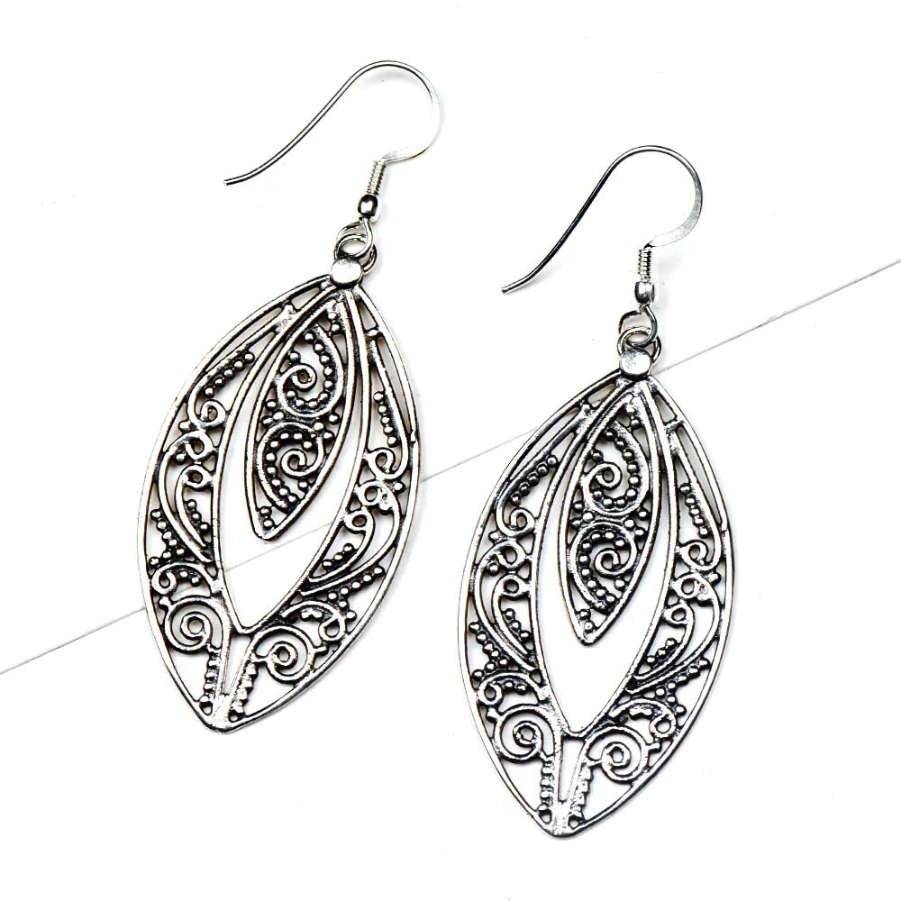 Ornate 92.5 Sterling silver dangle earrings oval almond with filigree work made by expert craftsmen of India. Gift it to your sister friend, wife mother and fiance on diwali, Christmas, new year, birthday or valentine . It goes well with any summer dress, tops, jeans etc.