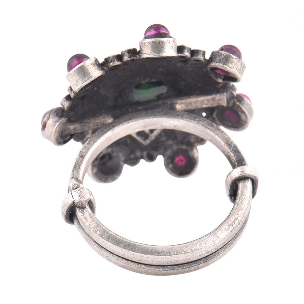 Modern adjustable oxidized 92.5Sterling silver ring studded with onyx and amethyst in the centre and on the edge of the petals of the floral design. Handcrafted to perfection this is the perfect accessory for sister, friend, mother and wife on weddings, Engagements, Bridal shower ,social functions, cocktails etc.