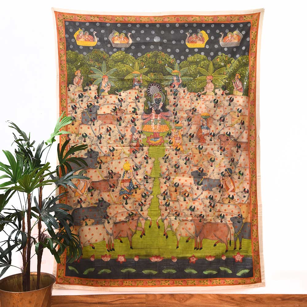 Rajasthan's Pichwai Cow Painting of Shreenathji on Sharad Purnima are a traditional type of art that represent incidents from Lord Krishna's life. One of the most well-known Pichwai paintings depicts Shreenathji, an avatar of Lord Krishna, with cows on the festival of Sharad Purnima. Sharad Purnima is a Hindu holiday held in the month of Ashwin, which falls in October or November. The moon is said to be closest to the earth on this day and to shine brightly. Lord Krishna, according to mythology, used to celebrate this occasion by playing his flute and dancing with the Gopis in the moonlight. This celebration is vividly shown in the Pichwai art of Shreenathji with cows on Sharad Purnima. Shreenathji is seen in the picture standing in the center, surrounded by cows. The backdrop is painted in blue tones to reflect the night sky, and the moon is seen shining brightly. Shreenathji is pictured playing his flute while the cows watch. The artwork depicts the beauty and peacefulness of the occasion and is a visual expression of Shreenathji's intimate affinity with the cows. Cows are revered in Hindu mythology and are considered sacred creatures. They are thought to symbolize motherly love, selflessness, and purity. The cows in the Pichwai picture of Shreenathji with cows on Sharad Purnima are completely dedicated to Shreenathji and are attentively listening to his singing. Finally, the Pichwai cow painting of Shreenathji on Sharad Purnima is a lovely depiction of the event and the close link between Shreenathji and the cows. The picture depicts the moment's beauty and tranquillity and serves as a reminder of the value of love, devotion, and nature in Hindu philosophy.