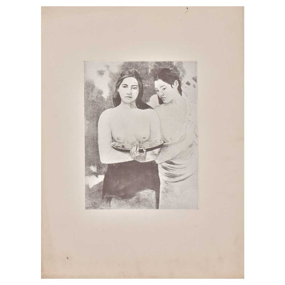 It depicts two topless women, one holding mango blossoms, on the Pacific Island of Tahiti. Although Tahiti is depicted as an innocent paradise, the two women in the painting confront the viewer in a way similar to that of Olympia and follow an artistic tradition of comparing woman's breasts to flowers or fruit.