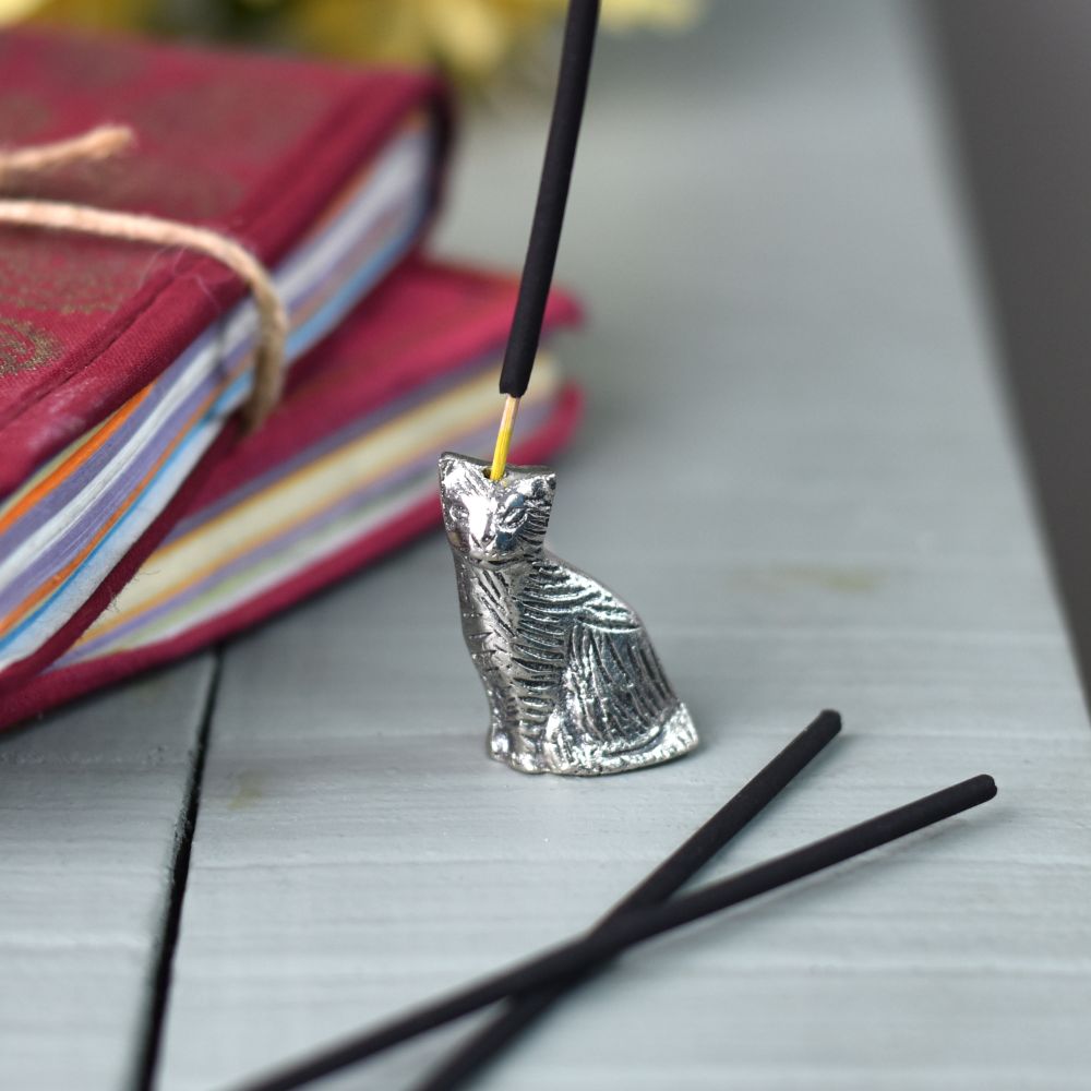 Brass Cat Statue with home temple incense stick holder is extremely attractive and eye-catching increases the interior design value of a home, business, hotel, etc. It is the best gift for anniversaries of marriage, parents, Mother's Day, wedding return gifts, birthdays, house warmings, shop or office openings, and festive occasions like Diwali and Grah pravesh. The finish is an aged silver.