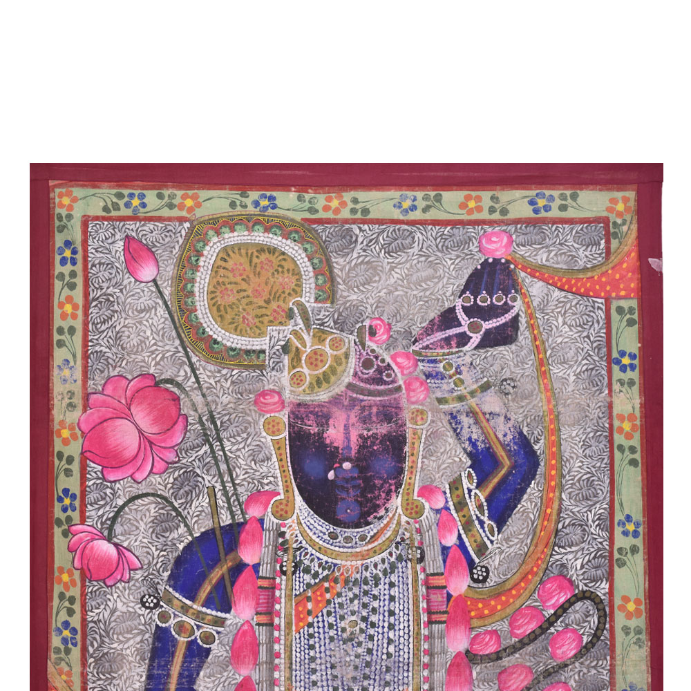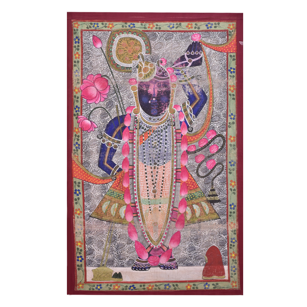 Sreenathji Pichwai Painting in a traditional attire along with a garland of flowers and holding lotus flower. This painting is created by devotee-artists of Nathwara. Lord SreenathJi Pichwwai Painting is a very popular wall decoration for home, hotel and lobby decoration, temple decoration, conference hall, resort , Diwali gift, house warming gift and stage decoration.