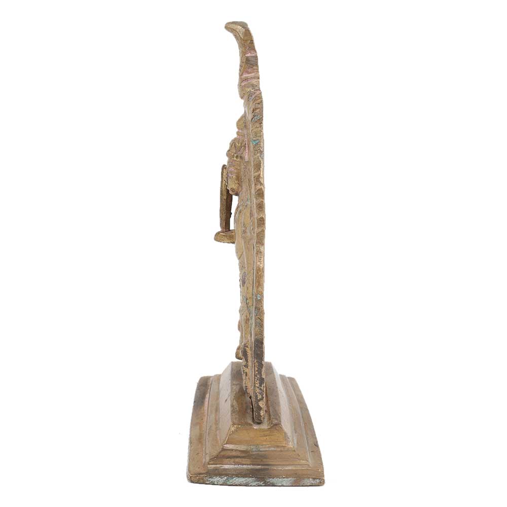 Hand made brass standing deity, depicted standing with four arms and cobra hood on top with arched panel behind arched plaque, raised on stepped base. used for worship, puja and temple decoration, souvenir, hotel, restaurant decoration, wedding gift, anniversary gift and special gift on Diwali for your near and dear ones.