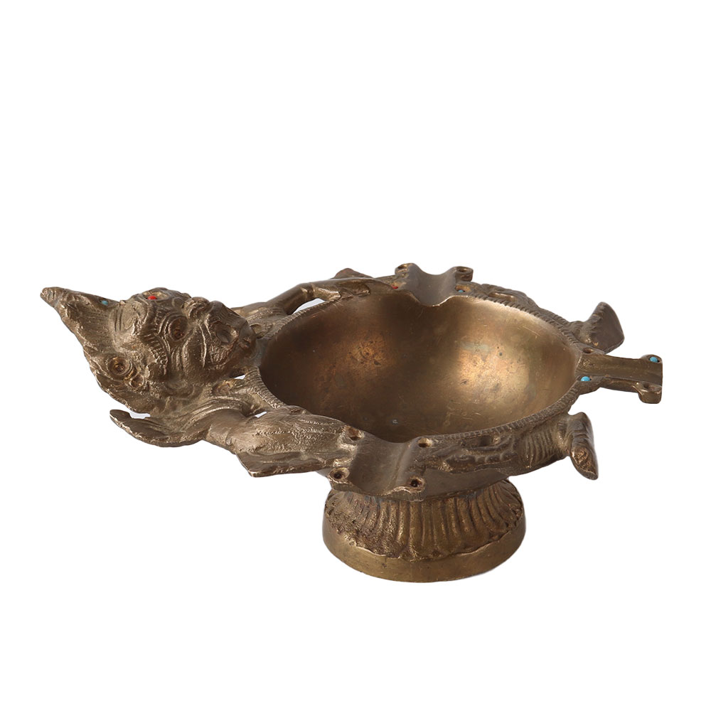 Handcrafted intricately carved brass ashtray in the shape of Mahakala , a Buddhist deity with decorative edges embedded with tiny stones. The face on this brass ashtray resembles Mahakala, the Tibetan protector god, rather than a demon. The Tibetan god Mahakala has four arms. In Himalayan Vajrayana Buddhism, there are several terrifying-looking protective Gods. The feel is heavy and solid. An elegant present for family and friends. It has three cavities to hold cigarettes .