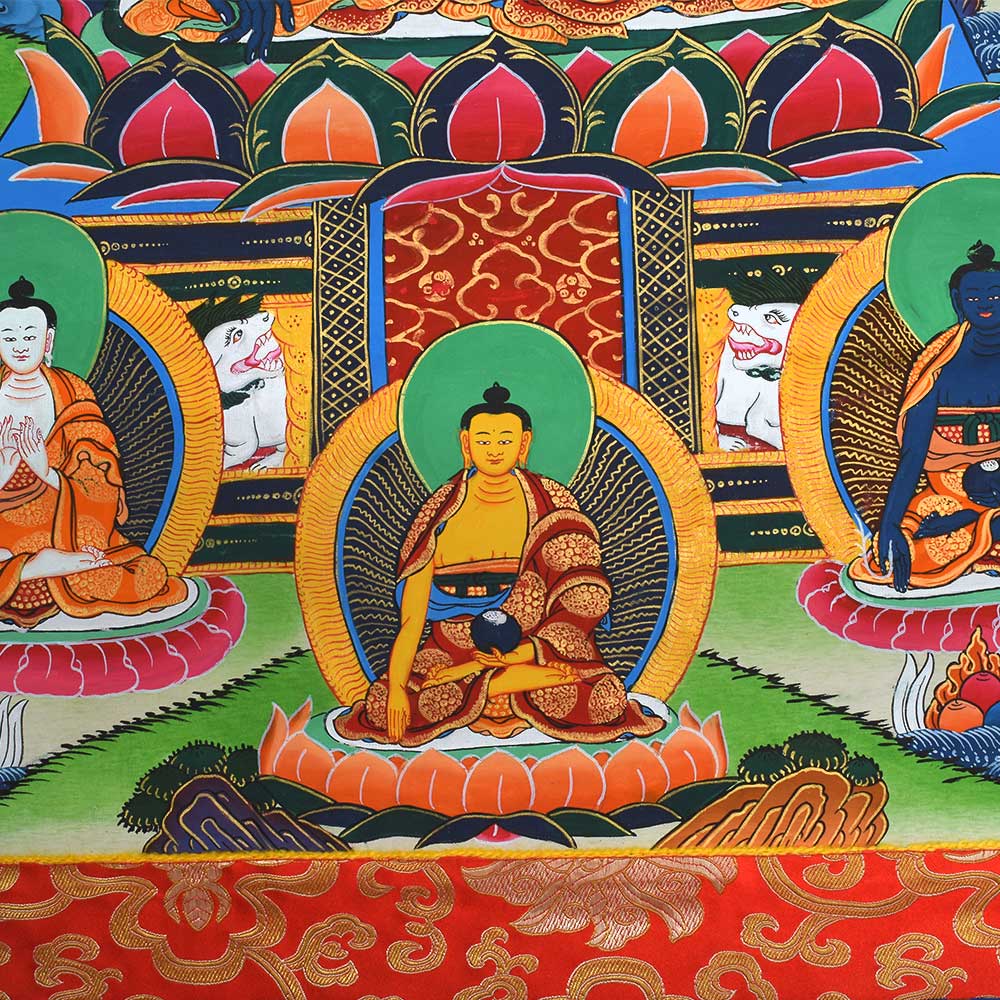The thangka features an intricate depiction of the Eight Medicine Buddha. The Medicine Buddha is a compassionate and healing god. He is said to help people who are suffering from mental or physical illnesses. His picture is frequently depicted with beams of lapis lazuli light emanating from his crown. The ultimate source of healing is represented by the Eight Medicine Buddha Design.