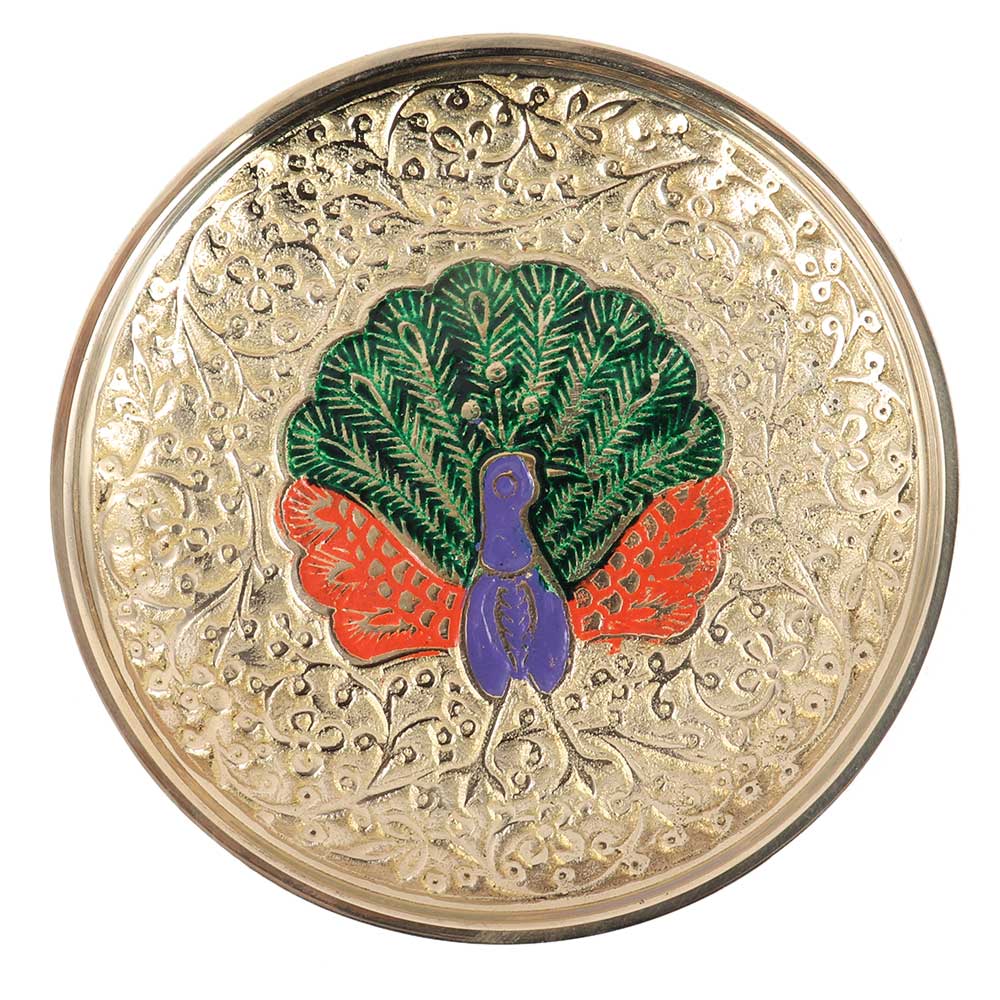 Meenakari Peacock designs on a solid brass coaster with green, saffron, blue and white colours similar to our national flag. It comes with an elegant pattern and is ideal for gifting or for home décor. This useful object can be used as a focal point in your living area or on your dining table.