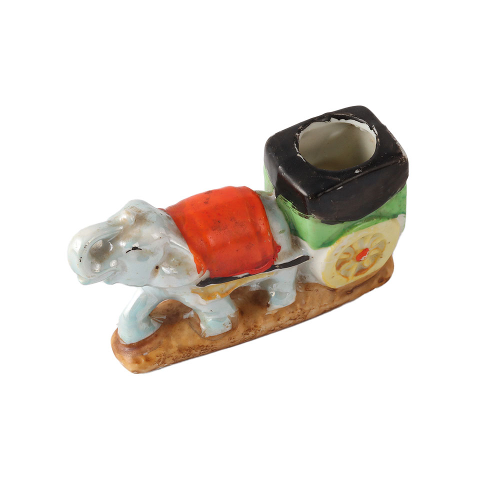 Beautifully hand-painted mid-century Elephant figure pulling a planter with vivid red and green accents while covered in a multi-coloured glazing finish. The planter/figurine is in excellent vintage shape with no chips or cracks. Use it as a gift for friends and family or for interior or outdoor decoration.