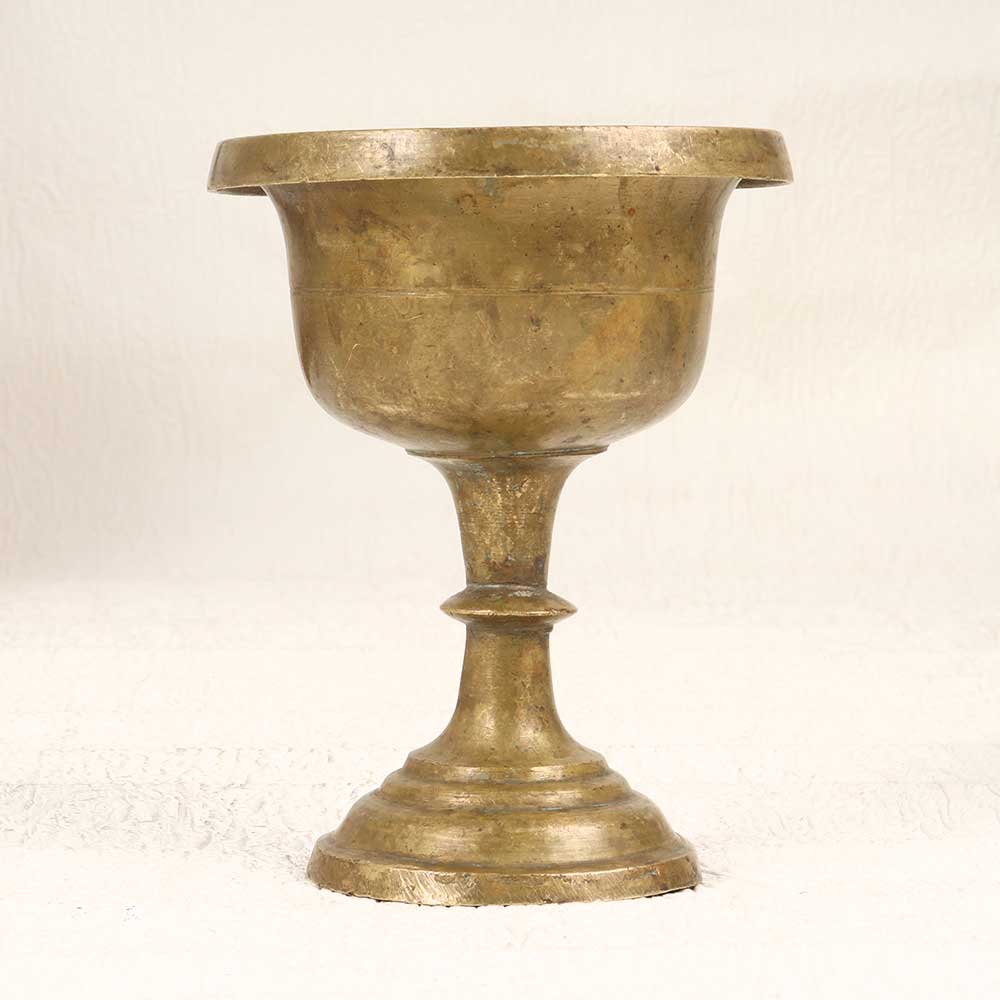 With intricate embossed details and antique brass styling, this vintage holy cup infuses pooja rituals with old-world tradition. Use this cup to present offerings or adorn your home shrine in vintage style. Its elegantly crafted brass form and aged finish provide an artifact-like quality, allowing you to connect with spiritual history and tradition. Seekers of old-world charm will love displaying this cup prominently in pooja rooms and home altars. The vintage styling transports you to earlier eras with its timeworn patina and intricacy. Honour your faith and ancestors with the aged elegance of this brass holy cup.