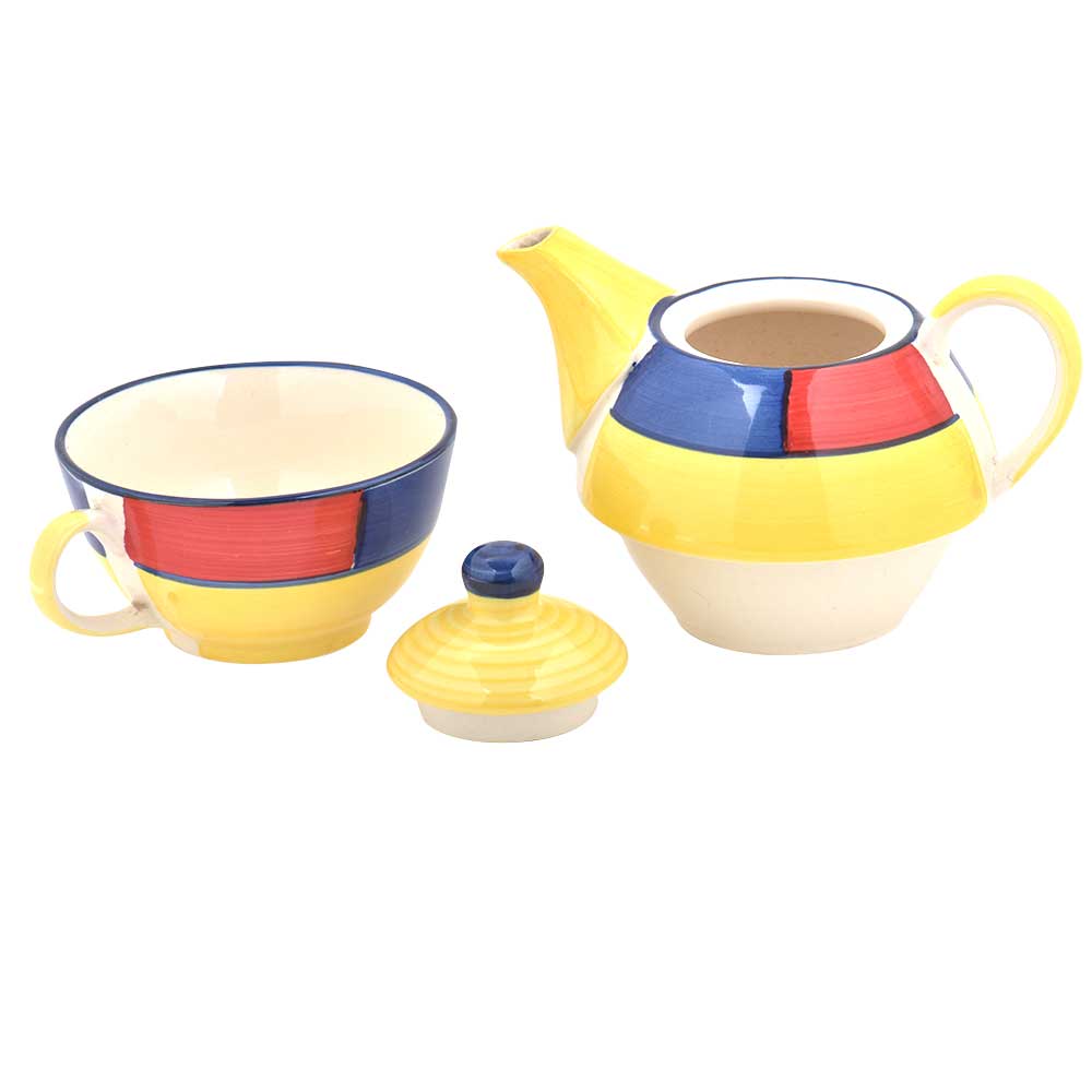 Handcrafted by the rural artiasns of India this is a unique and rare tea set where the kettle is placed on the cup. It is in a beautiful and fresh yellow color further decorated with blue and red . Enjoy your morning cup of tea and coffee in this lovely ceramic cup with kettle set.