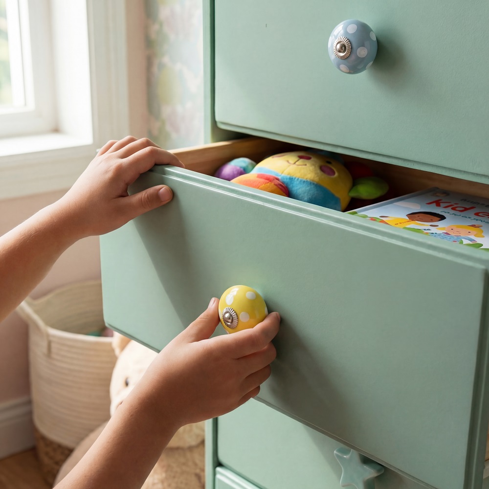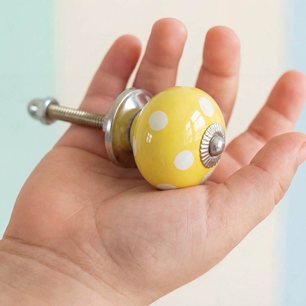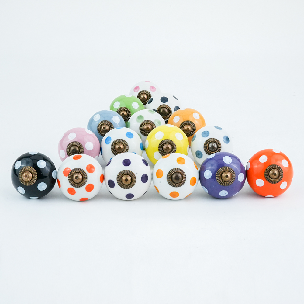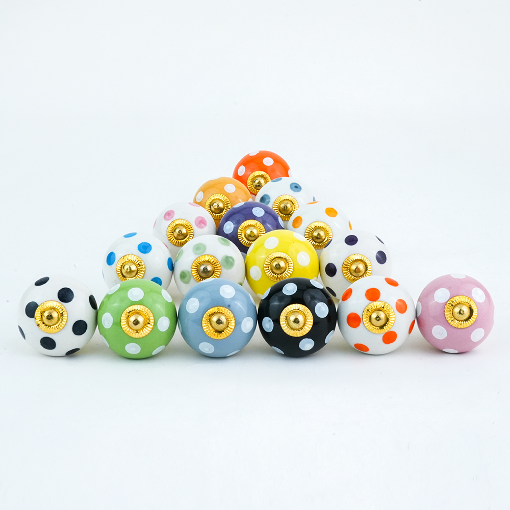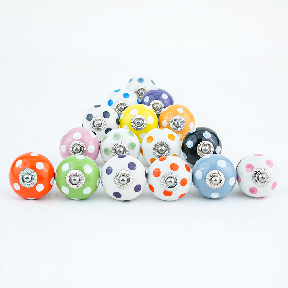 Handmade ceramic polka dotted knobs adds charm to your furniture. Ideal for drawers, dressers, cabinets, wardrobes, cupboards, doors, and almirahs.