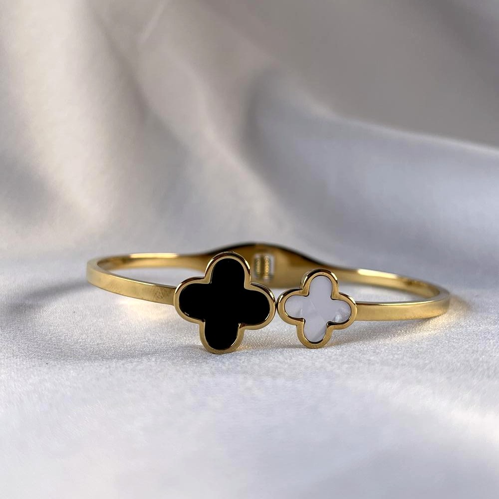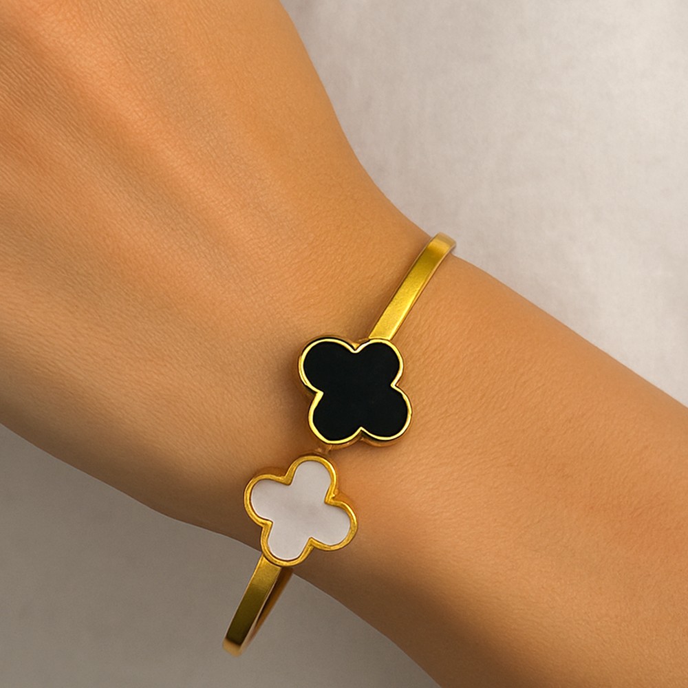 The 18K Gold Plated Black Monochrome Inspired Kada is a bold expression of modern elegance and structured design. Crafted from stainless steel and finished with radiant 18K gold plating, this kada is elevated by striking black monochrome accents that create sharp contrast and visual depth. Its clean, architectural silhouette offers a confident wrist presence while remaining comfortable for daily wear. Designed for lovers of minimal luxury, it feels refined, powerful, and timeless.