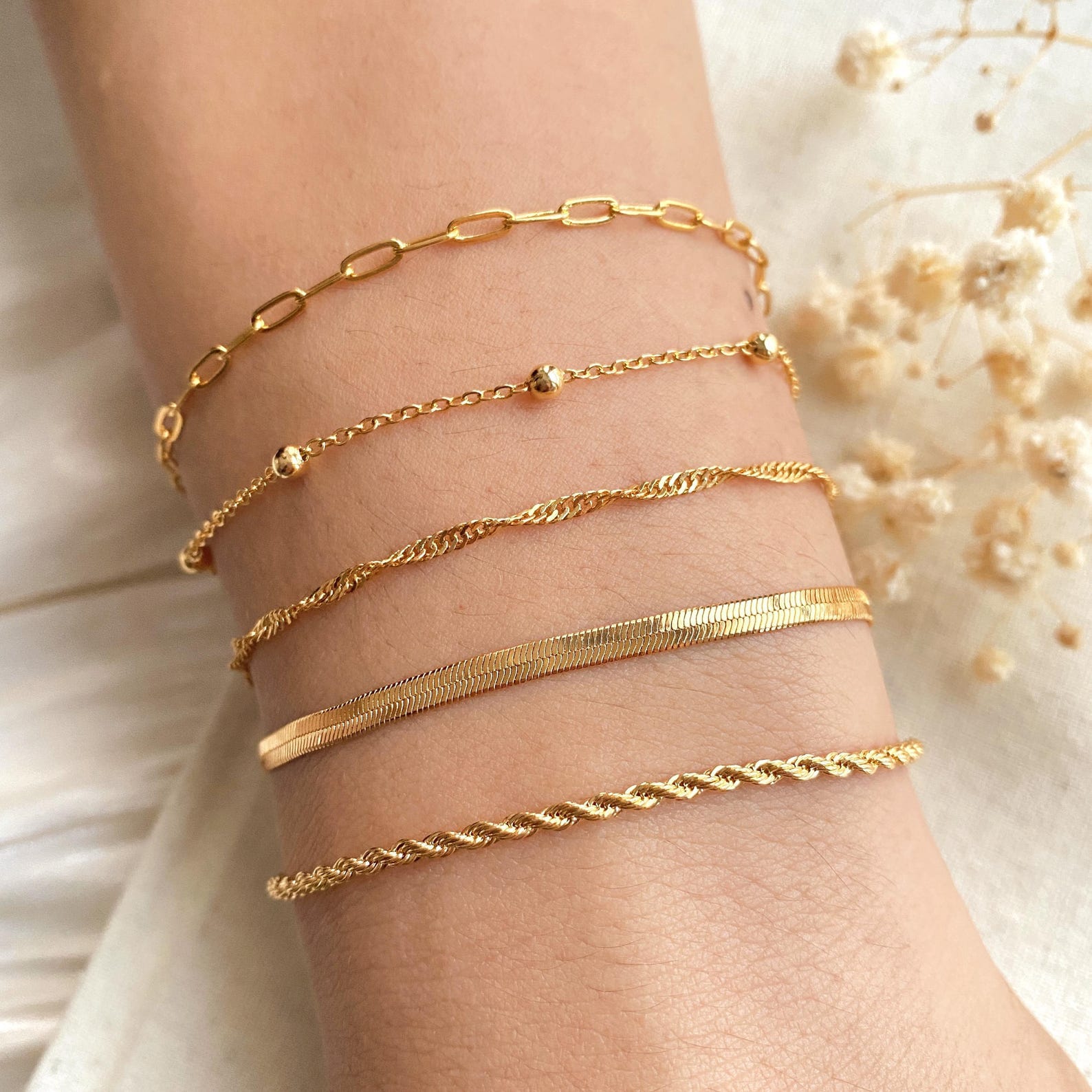 Yes, the set includes paperclip, herringbone, rope, and snake chain bracelets.