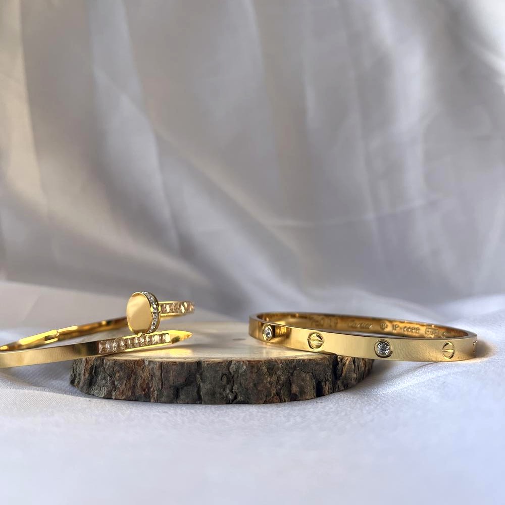 The 18K Gold Plated Classic and Nail Kada Set brings two distinct design philosophies together in one refined pairing. One kada reflects clean, traditional lines, while the nail-inspired piece introduces a contemporary, sculptural edge. Finished in warm gold tones, the set is crafted to move effortlessly between everyday wear and elevated occasions. Together, they create balance between restraint and expression.