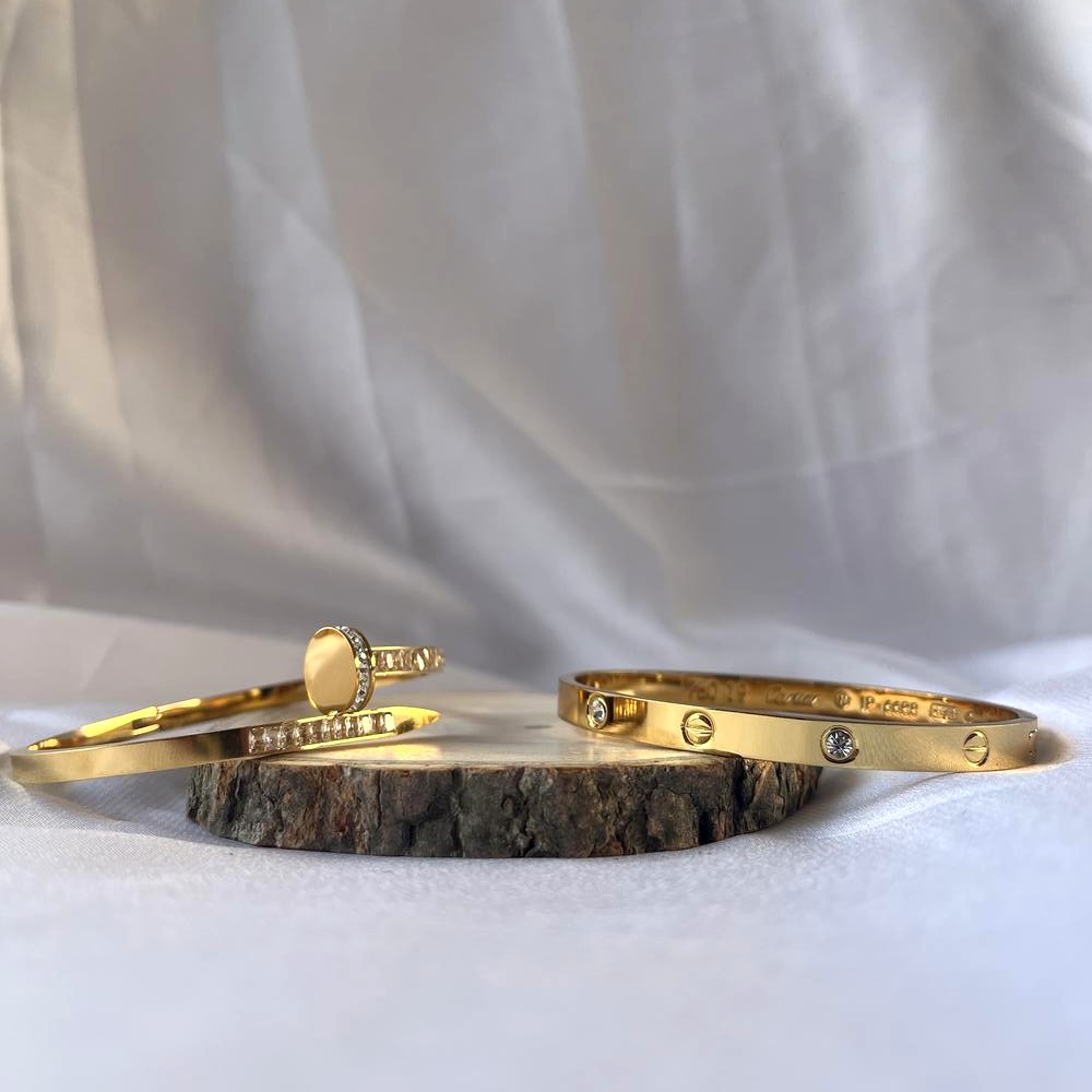 A curated set combining classic Cartier and nail-inspired kadas offers versatile styling. Packed and quality checked by Indianshelf. Classic & Nail Combo Highlights A curated set combining classic Cartier and nail-inspired kadas offers versatile styling. Set includes a classic Cartier-inspired kada and a nail-design kada in 18K gold Entirely handmade no machines used Versatile pieces can be worn separately or layered for chic looks Set Specifications & Materials Origin: India. Safely packed and quality checked by Indianshelf Entirely handmade no machines used Every product comes with verified hallmarks and an official certificate of authenticity for your assurance. Each kada in the set is adjustable for layering convenience Combo Kada Usage Inspiration Wear each kada separately or together for varied looks Gift to someone starting their jewellery collection Display in fashion boutiques offering sets Use in styling for fashion shoots that mix classic and edgy designs Combo Kada Care Tips Wipe each kada separately; avoid water and chemicals; store pieces apart to prevent scratches. Combo Kada FAQ Do both kadas come together Yes, this is a set of two. Can I wear them separately Yes, they are designed to be worn individually or together. Is the set adjustable Each kada has an adjustable fit. Are the designs complementary The classic and nail designs complement each other. Combo Craftsmanship Excellence Every piece reflects heritage artistry and careful attention to detail. All our products are handmade never machine-made ensuring individuality.